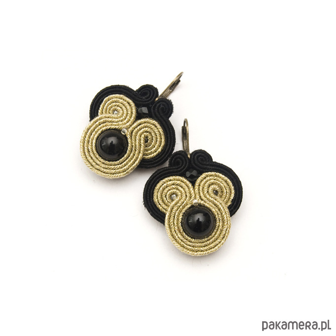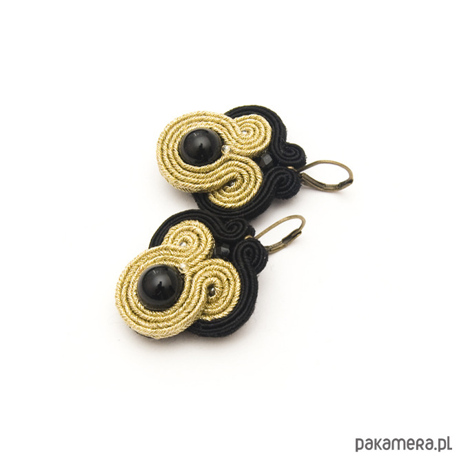 "Złoto czarne kolczyki sutasz - onyks" wykonane są techniką haftu sutasz. Zrobione z koralików z czarnego onkysu, szklanych koralików, sznurków sutasz i bigli w kolorze antycznego złoto (istnieje możliwość wymiany na inne). Tył kolczyków stanowi czarna skóra naturalna. Długość kolczyka to około 4,5 cm, szerokość w najszerszym miejscu wynosi około 2,5 cm.
