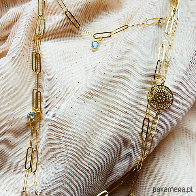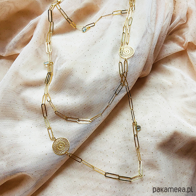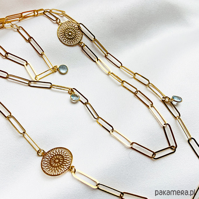 Bardzo piękny naszyjnik stworzony z łańcucha z szerokich ogniw , filigranowych zawieszek rozet oraz topazów w oprawie. Naszyjnik jest bardzo długi i nie posiada zapięcia, można go dowolnie układać na szyi w wielu kombinacjach i długościach. Pozostawia różne możliwości stylizacji zarówno do długiej eleganckiej sukni jak i bardziej na co dzień w długości przy szyi. Może byc noszony z przodu jak i z tylu do sukni z dekoltem na plecach. Naszyjnik można nosić również jako bransoletę.