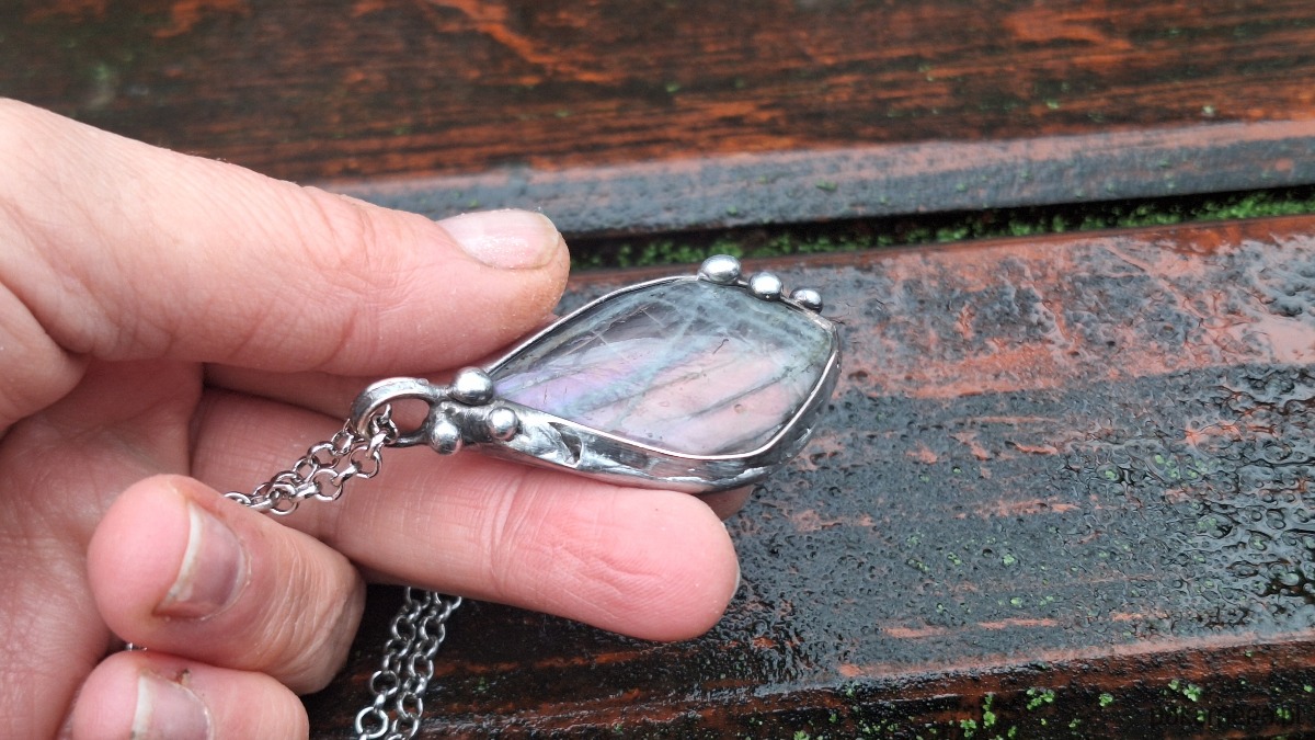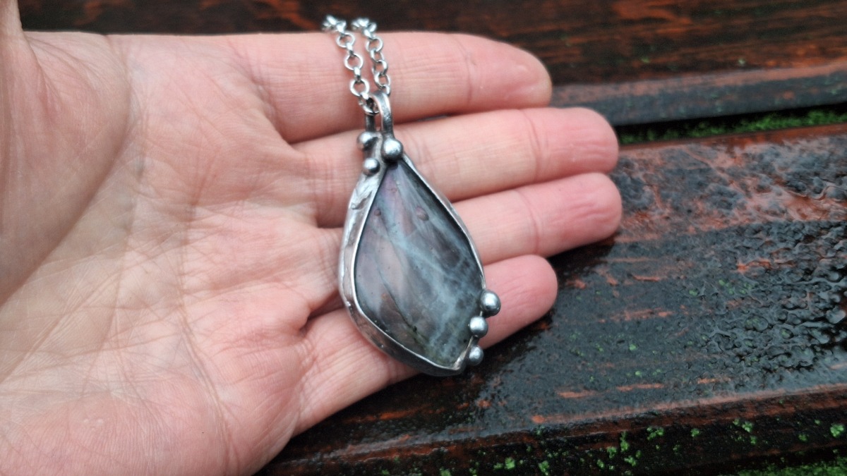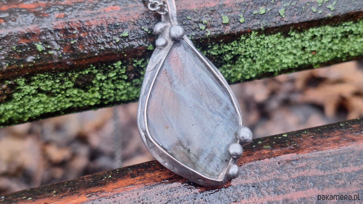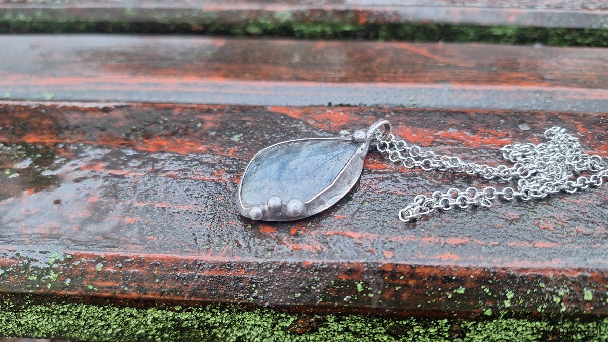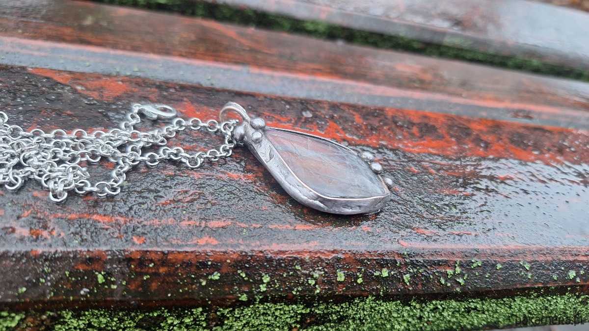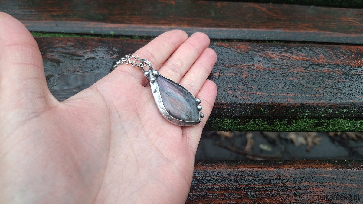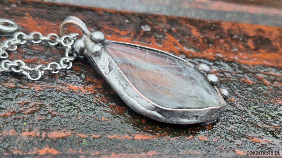 Wisiorek wykonany z miedzi, cyny i labradorytu. Wymiary ok. 4.5 na 2.5 cm. Zawieszony na łańcuszku o długości ok. 50 cm.