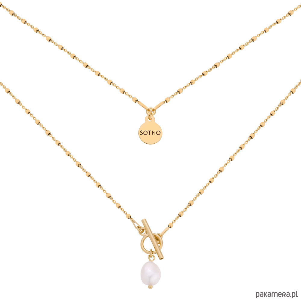 Złoty kosteczkowy naszyjnik z ozdobnym zapięciem, naturalną, nieregularną perłą i zawieszką z logo marki. Całość wykonana ze srebra 925 powlekanego 24 karatowym żółtym złotem.