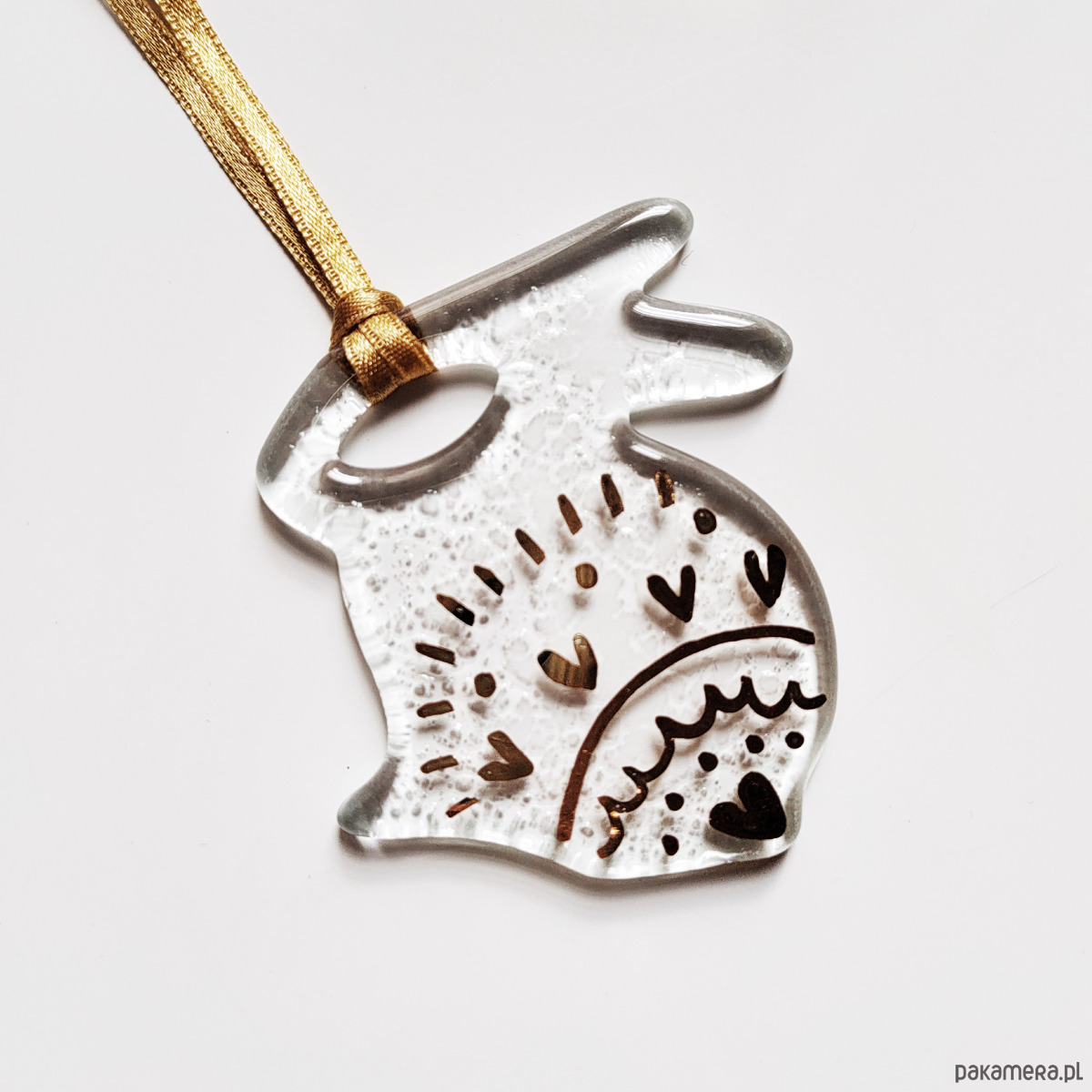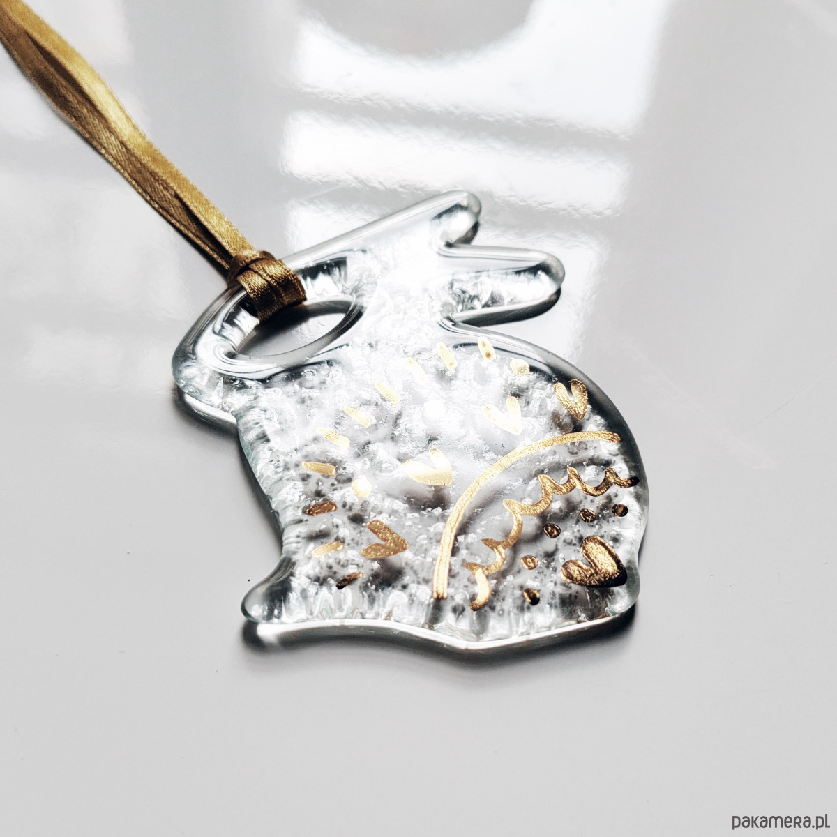 Autorska świąteczna zawieszka wykonana ze szkła metodą fusingu. Ozdoba wykonana ze szkła bezbarwnego, malowana ręcznie prawdziwym złotem. Spód szkła posiada delikatną fakturę ciekawie odbijającą światło.
