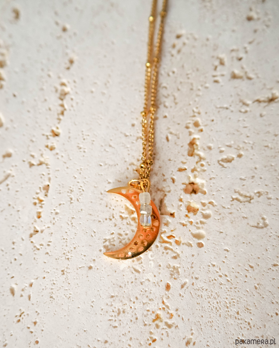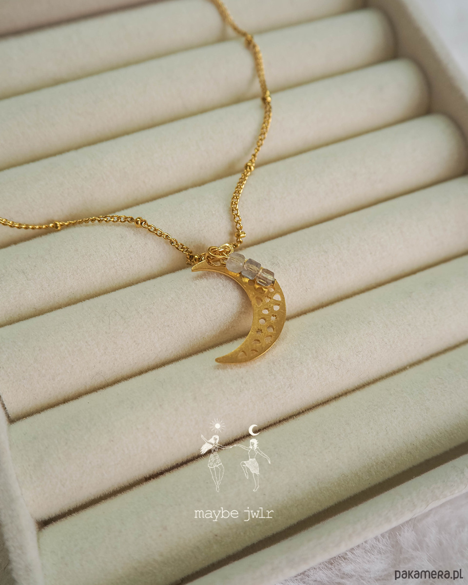 Zawieszka księżyc ma wymiary 20x15mm, a księżycowi towarzyszy ręcznie zrobiona zawieszka z labradorytem, która symbolizuje ochronę, intuicję i duchowy rozwój.