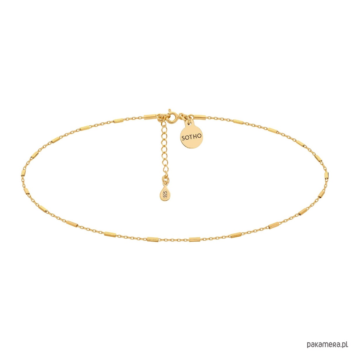 Złoty łańcuszkowy choker z zawieszką z logo marki. Naszyjnik posiada łańcuszek regulacyjny. Całość wykonana ze srebra 925 powlekanego 24 karatowym żółtym złotem.