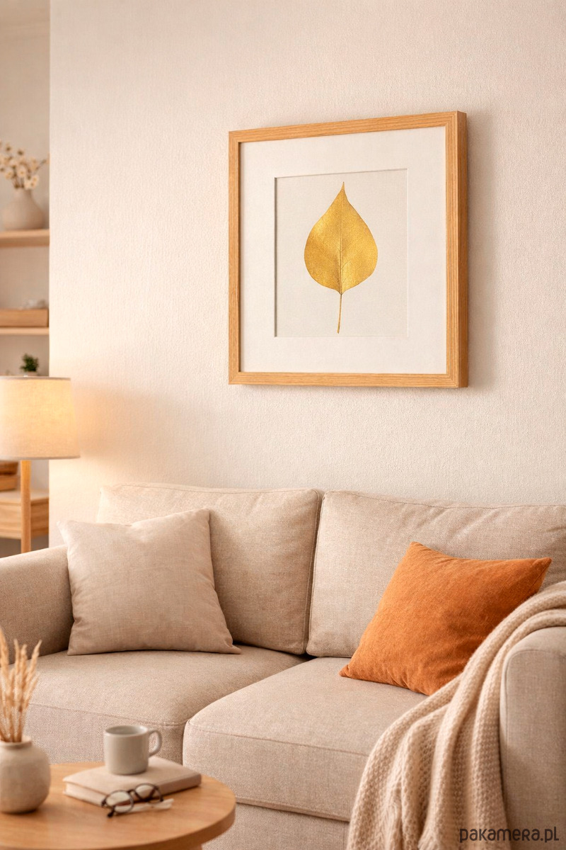 Złoty Liść Bzu. Naturalny Dekor Ścienny. Drewniana Ramka Obraz 20x20cm