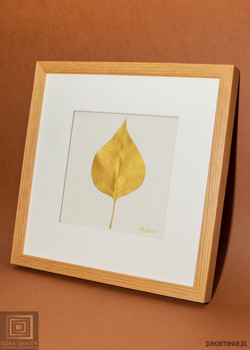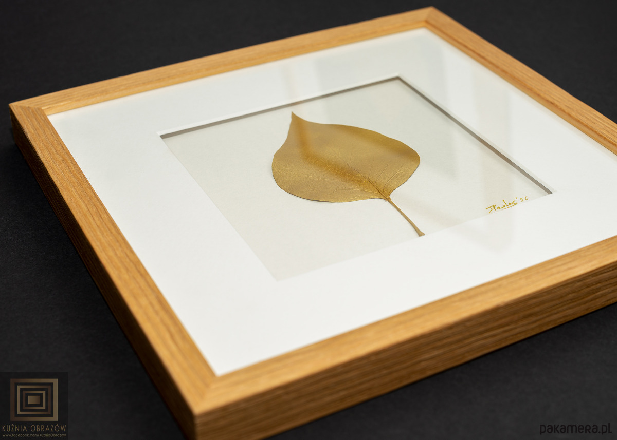 Złoty Liść Bzu. Naturalny Dekor Ścienny. Drewniana Ramka Dąb 20x20cm