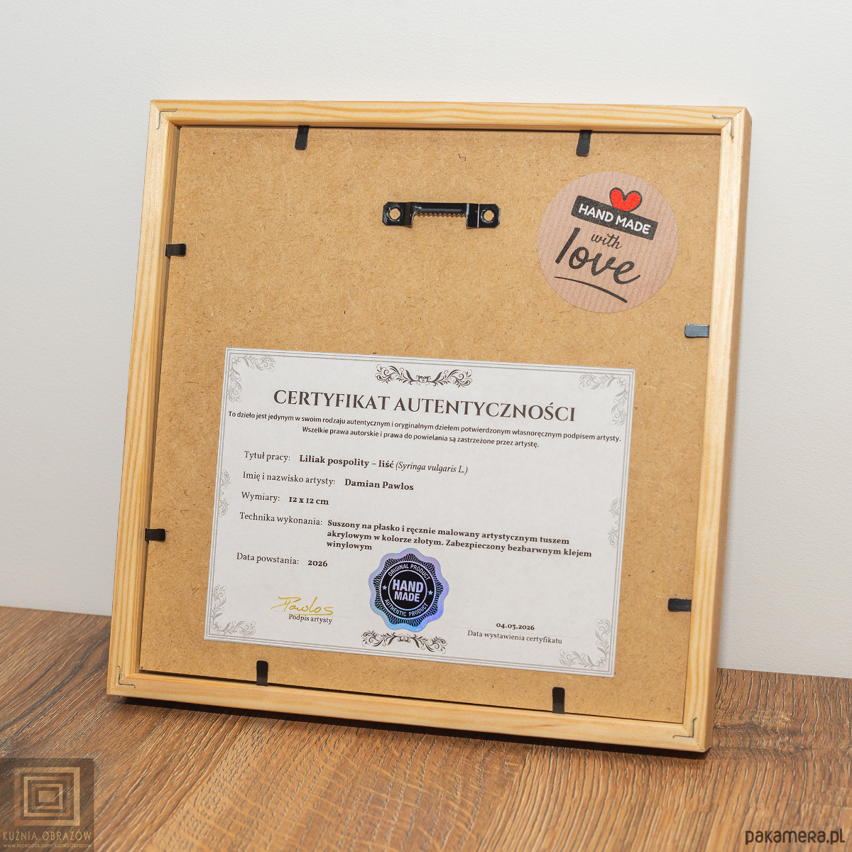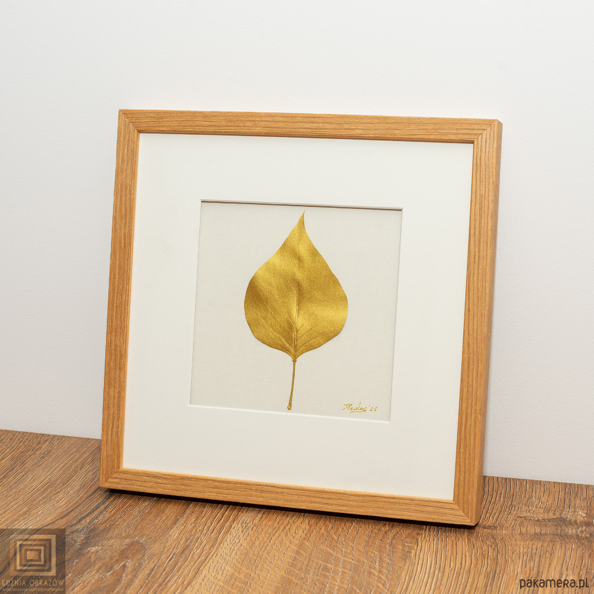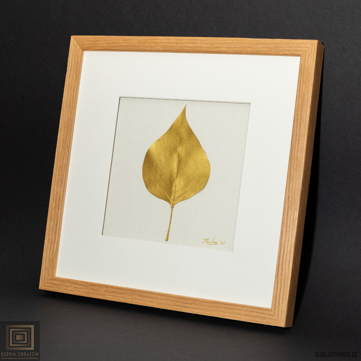 Praca oprawiona w elegancką ramkę z litego drewna o wymiarach 20x20 cm z białym passe-partout i szklaną szybką. Zastosowano passe-partout z niewielkim dystansem, który zwiększa wrażenie głębi, tworząc delikatny cień i potęgując efekt 3D całej kompozycji.