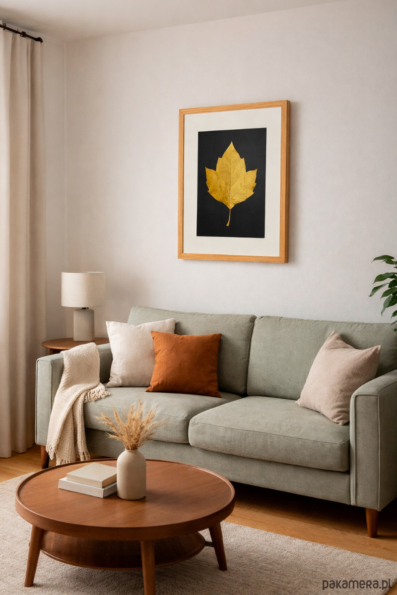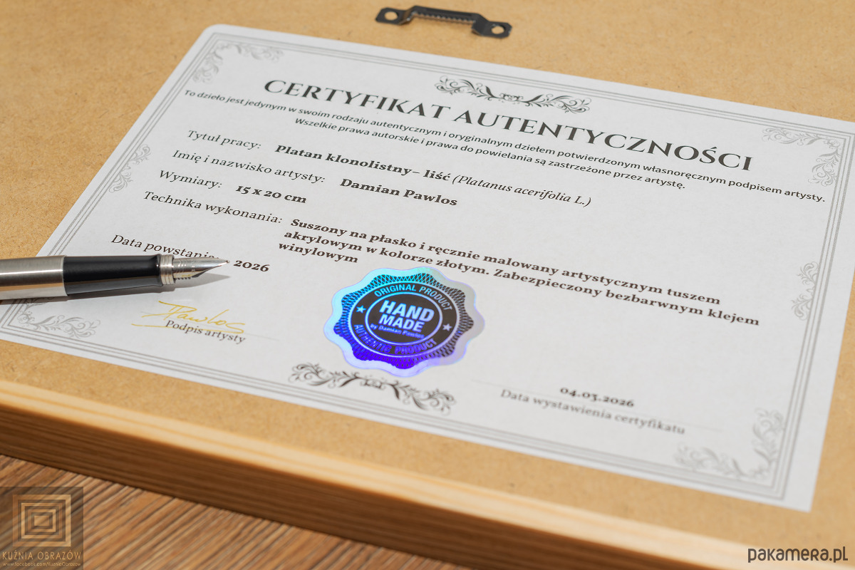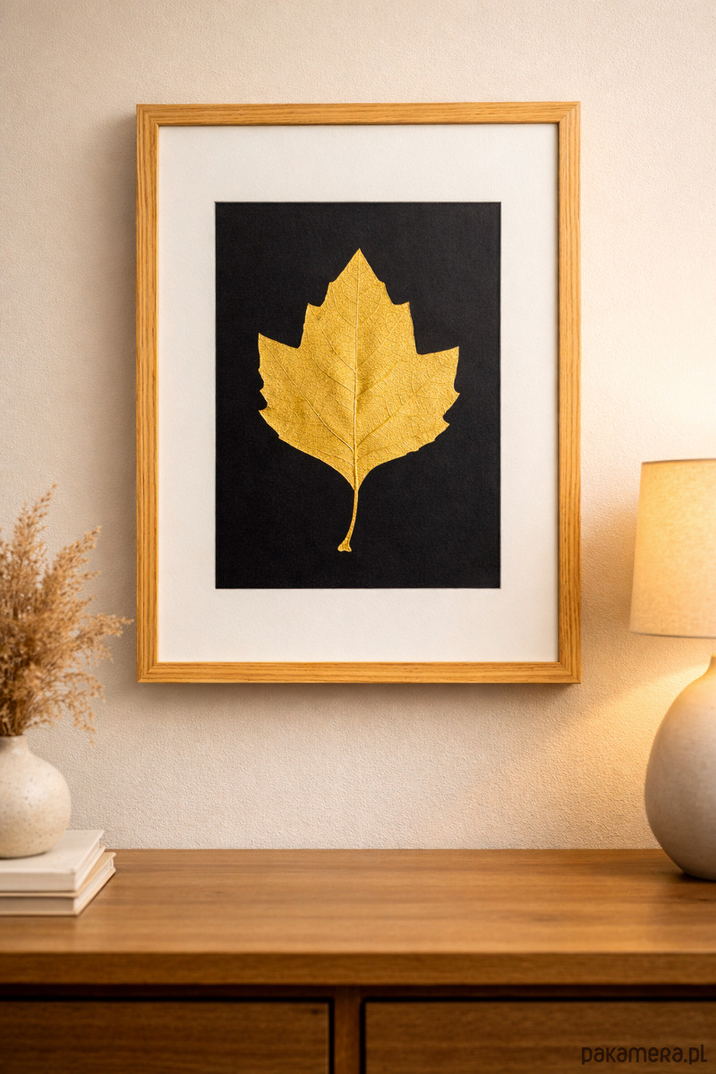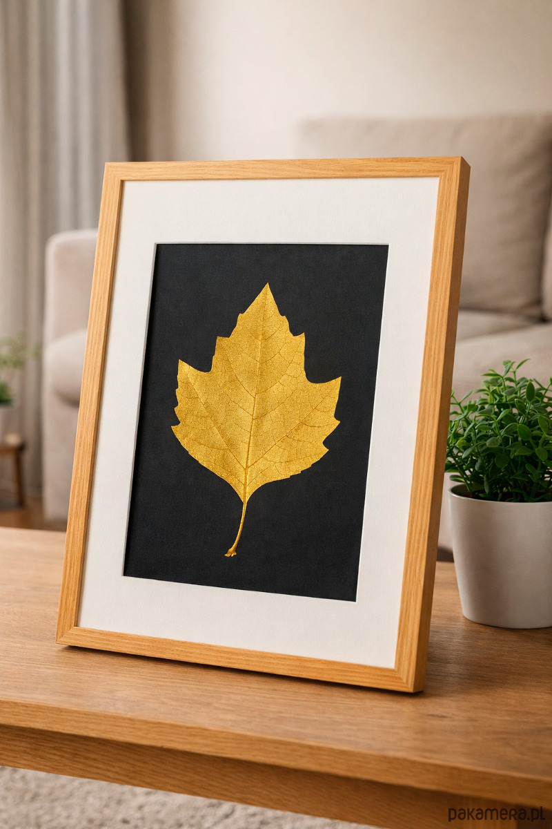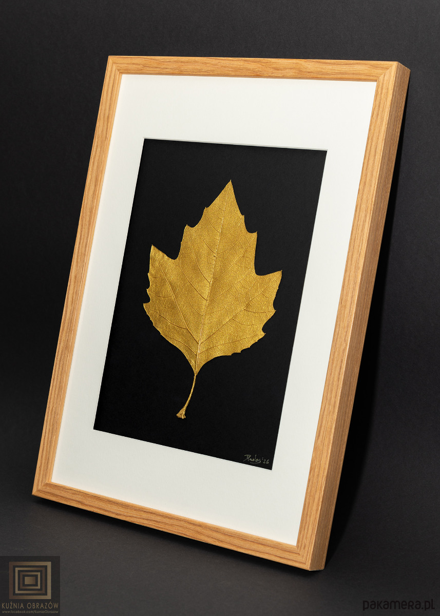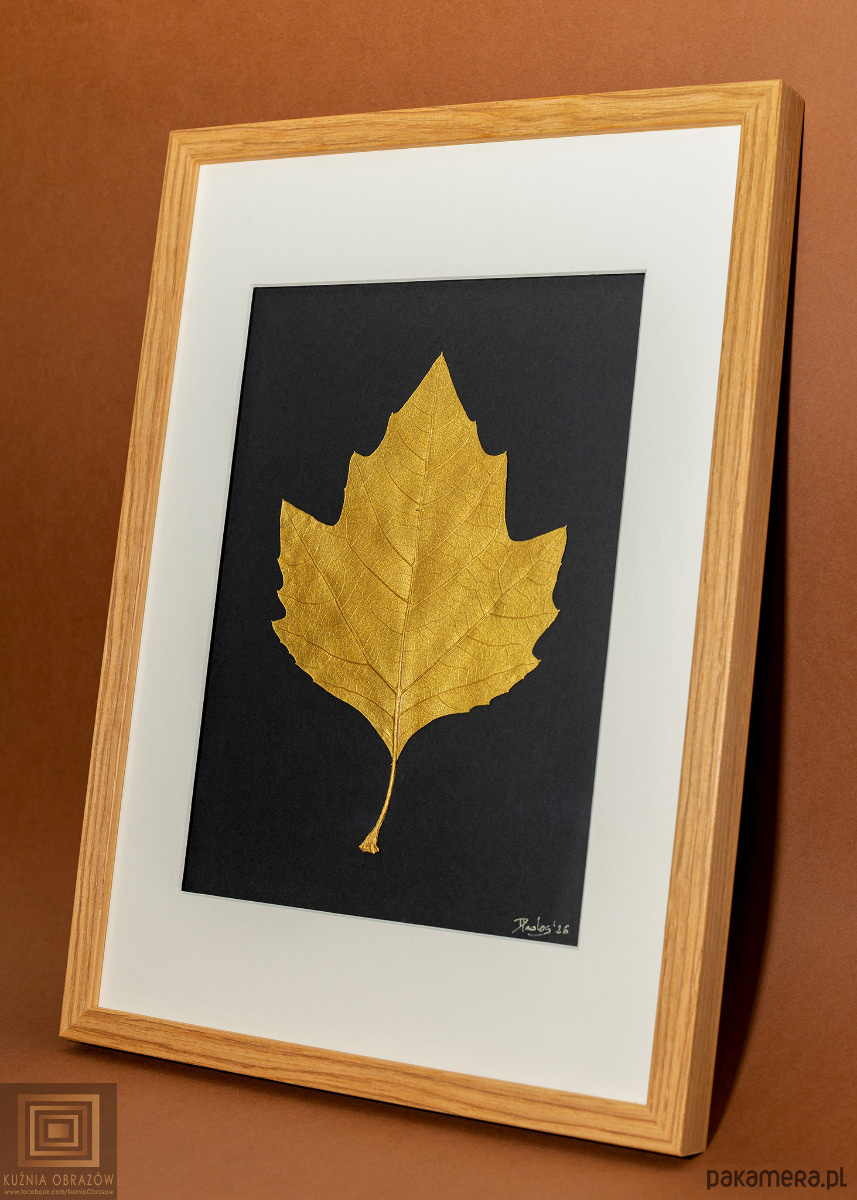 Złoty Liść Platan Klonolistny w Dębowej Ramie 20x30cm. Naturalny Obraz