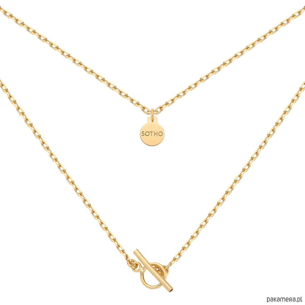 Złoty naszyjnik z ozdobnym zapięciem i zawieszką z logo marki. Całość wykonana ze srebra 925 powlekanego 24 karatowym żółtym złotem.