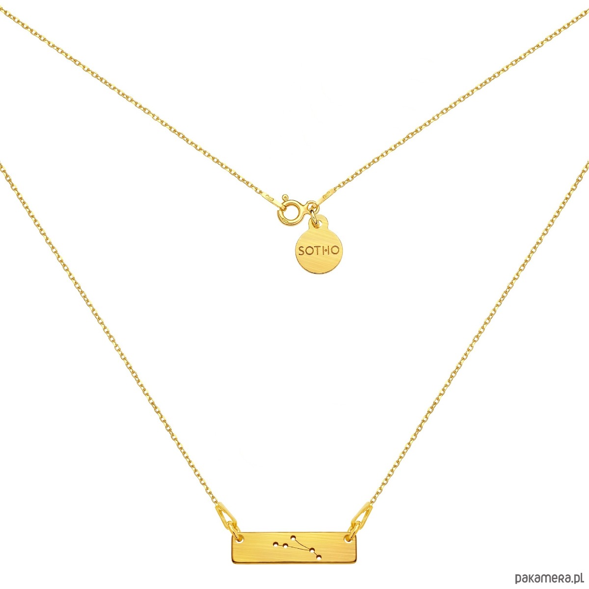 Złoty matowy naszyjnik łańcuszkowy zdobiony konstelacją zodiakalną Barana i zawieszką z logo marki. Całość wykonana ze srebra 925 powlekanego 24 karatowym żółtym złotem.