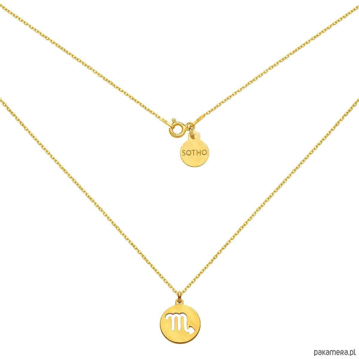 Złoty matowy naszyjnik łańcuszkowy zdobiony znakiem zodiaku Skorpion i zawieszką z logo marki. Całość wykonana ze srebra 925 powlekanego 24 karatowym żółtym złotem.