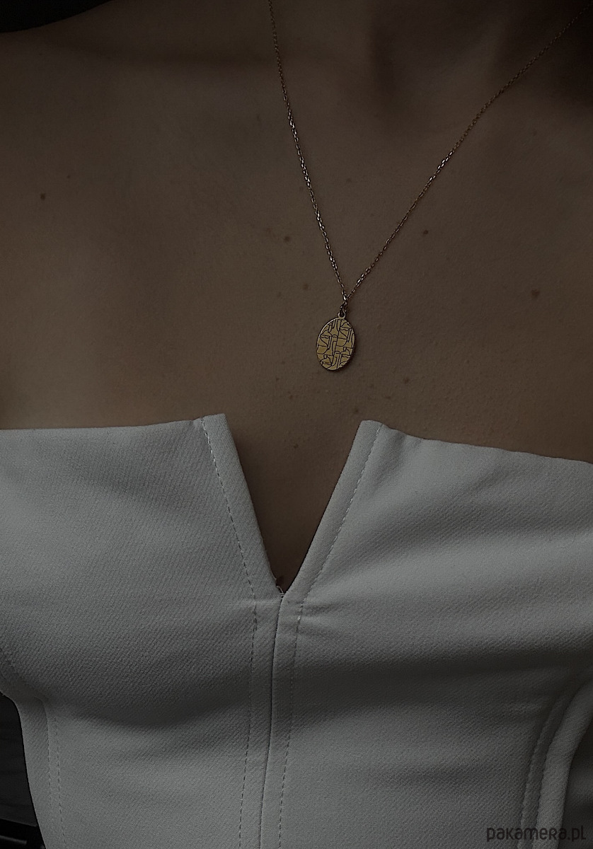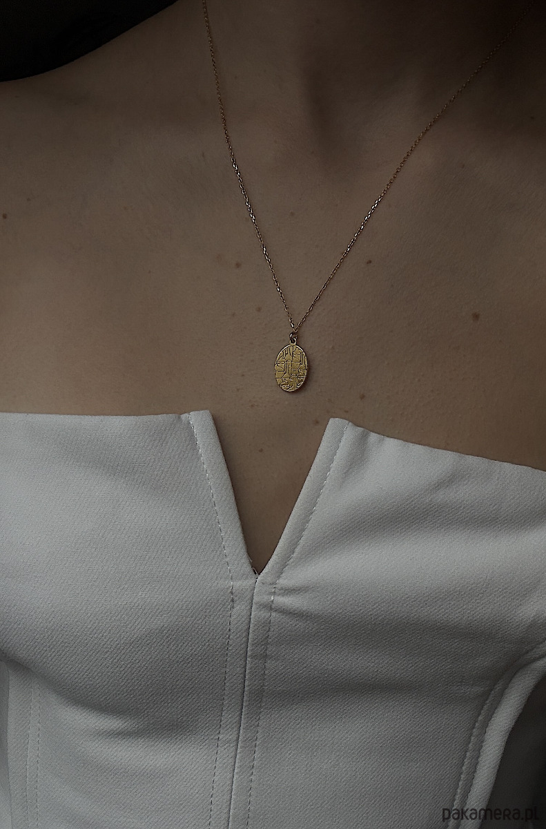 Złoty naszyjnik z medalionem Art N°1 i zawieszką z logo marki. Całość wykonana ze srebra 925 powlekanego 24 karatowym żółtym złotem.