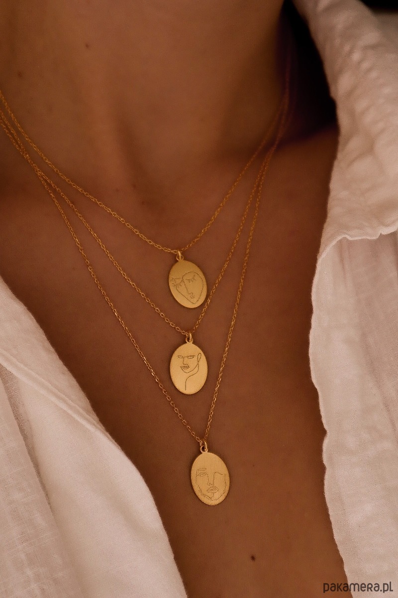 Złoty naszyjnik z matowym medalionem Face N°3 i zawieszką z logo marki. Całość wykonana ze srebra 925 powlekanego 24 karatowym żółtym złotem.