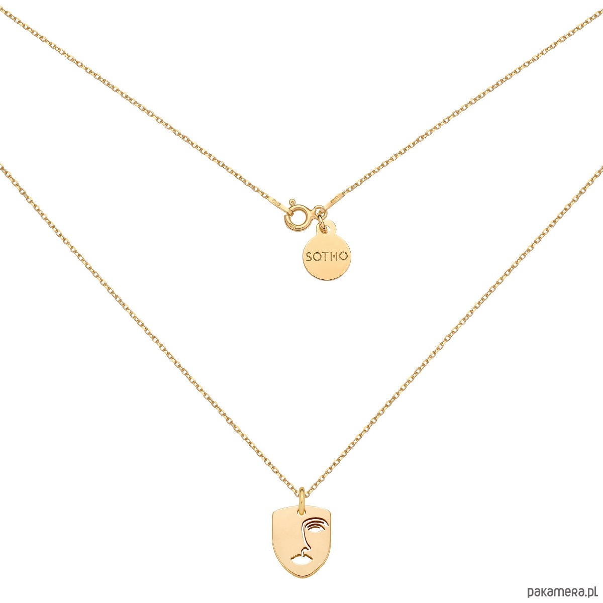 Złoty naszyjnik z medalionem Face N°6 i zawieszką z logo marki. Całość wykonana ze srebra 925 powlekanego 24 karatowym żółtym złotem.