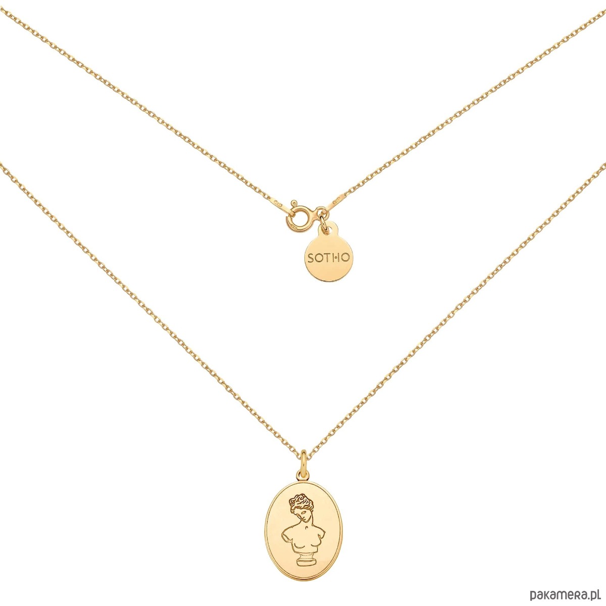Złoty naszyjnik z medalionem z boginią Afrodytą i zawieszką z logo marki. Całość wykonana ze srebra 925 powlekanego 24 karatowym żółtym złotem.
