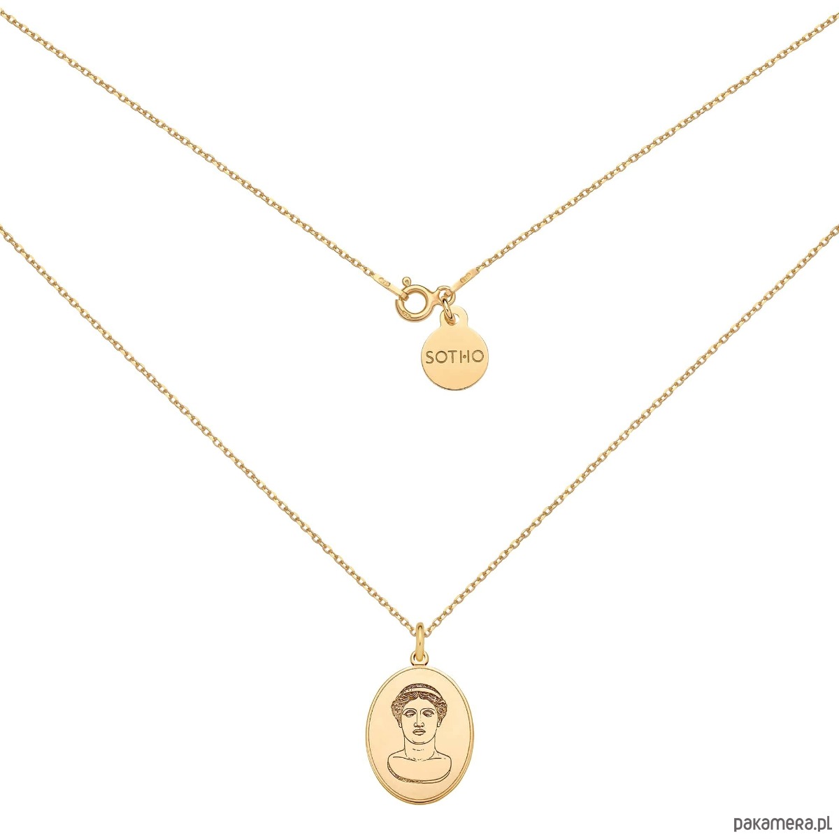 Złoty naszyjnik z medalionem z boginią Herą i zawieszką z logo marki. Całość wykonana ze srebra 925 powlekanego 24 karatowym żółtym złotem.