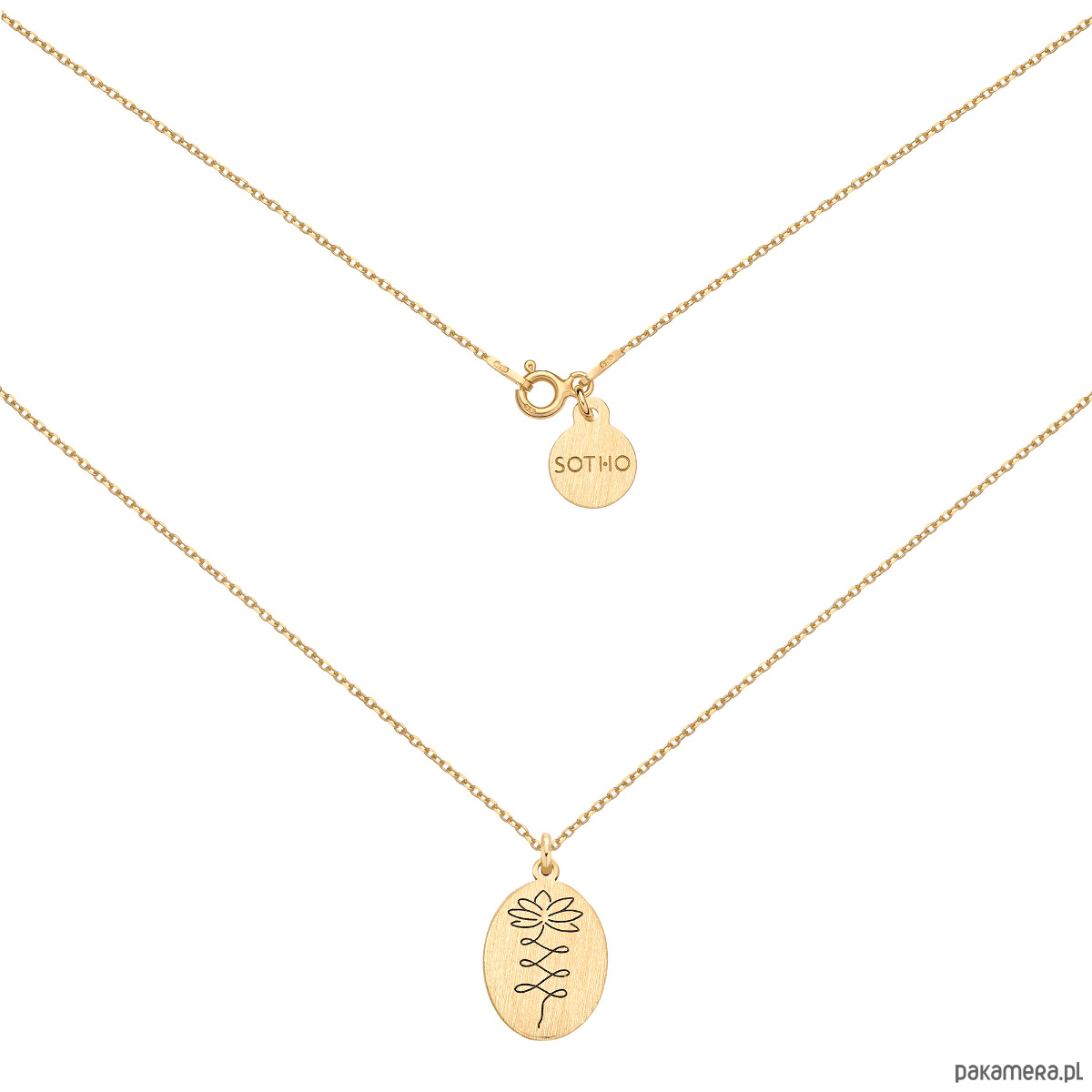 Złoty matowy medalion z lotosem i zawieszką z logo marki. Całość wykonana ze srebra 925 powlekanego 24 karatowym żółtym złotem.