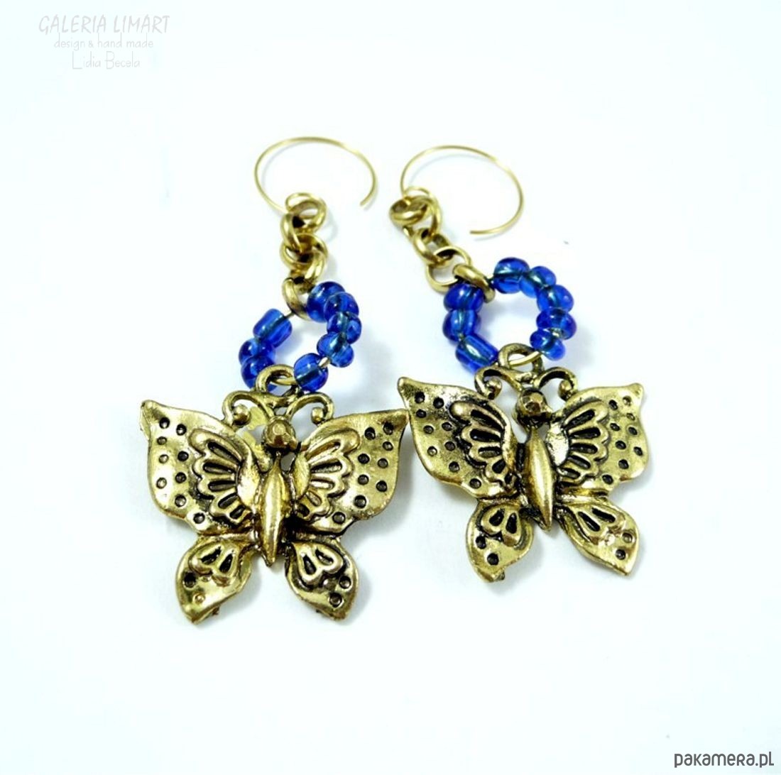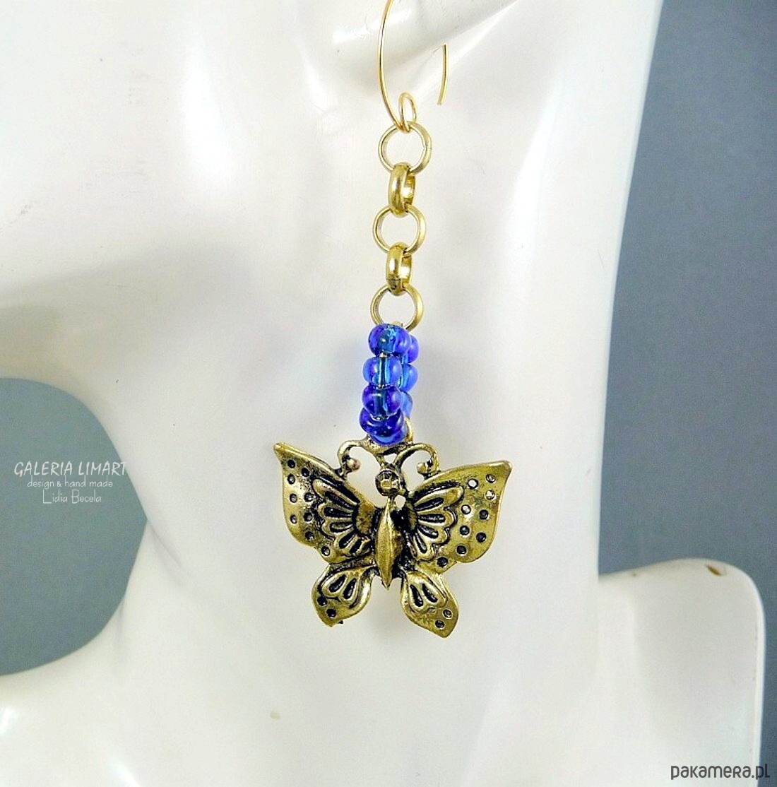 Złoty motyl z kobaltem urocze długie modne kolczyki w stylu boho handmade