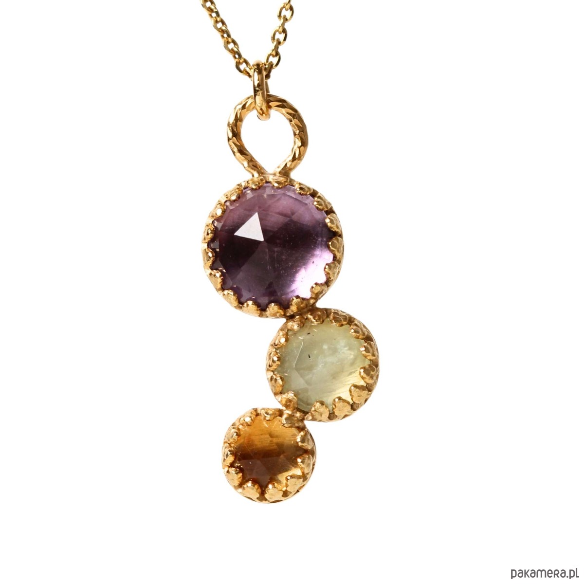 Ręcznie wykonany naszyjnik ze srebra pokrytego 24-karatowym złotem w bajecznych kolorach z ametystem, prehnitem i cytrynem