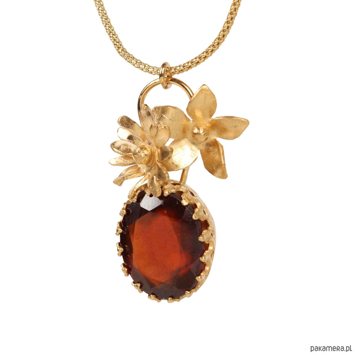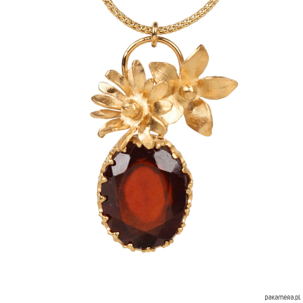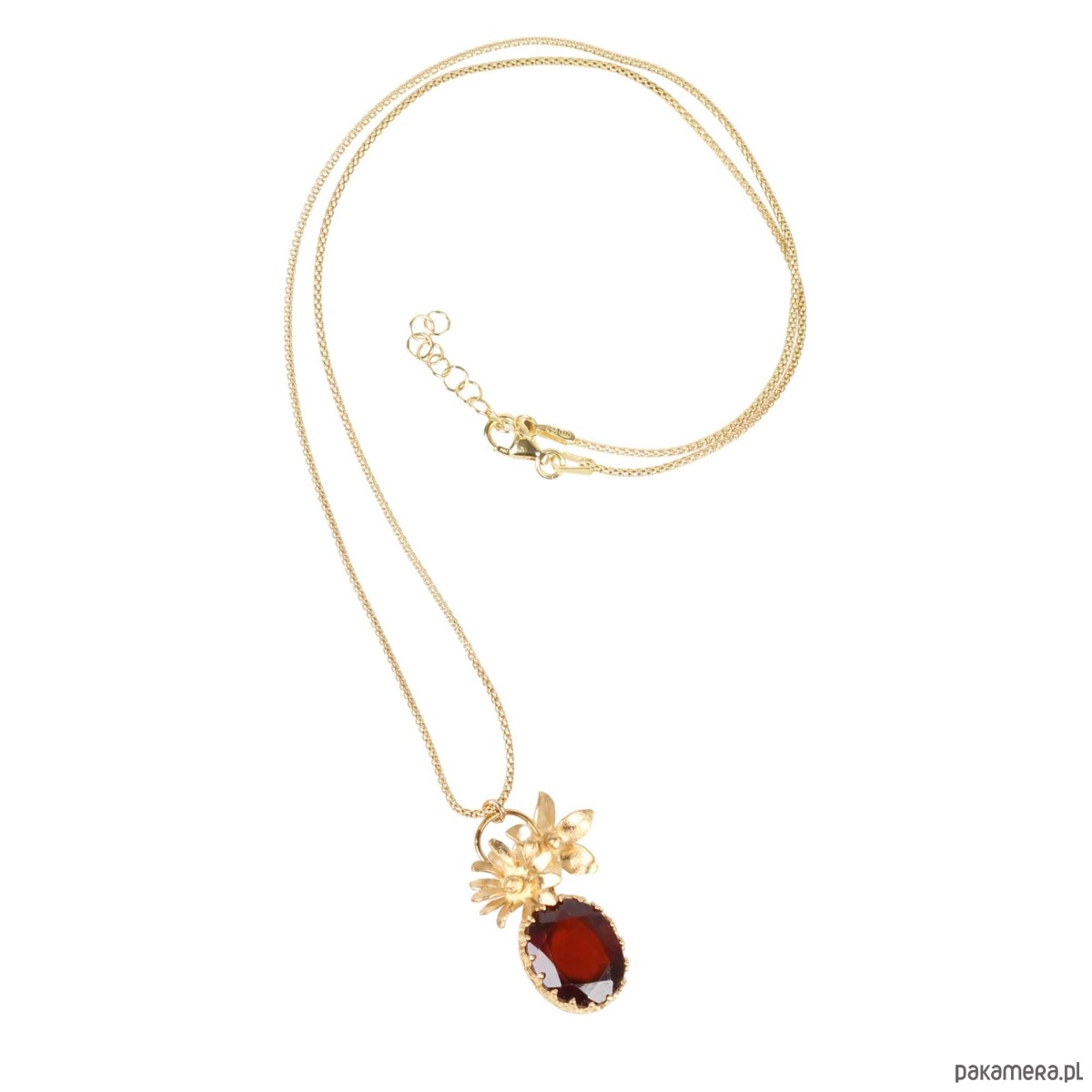 Ręcznie wykonany wisiorek z dużym, czerwonym granatem i z trójwymiarowymi kwiatami ze srebra pr. 925 pokrytego 24-karatowym złotem na diamentowanym łańcuszku.