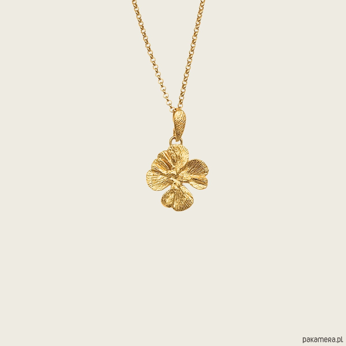 Motyw koniczyny ma wielkość 1,9 x 1,9 cm, długość z zawieszką wynosi 3,1 cm.Długość łańcuszka do wyboru:A - 40 cm + przedłużkaB - 50 cm + przedłużkaSrebro pozłacane 24 karatowym złotem