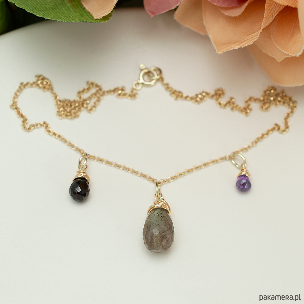 Złoty naszyjnik, labradoryt, spinel, pozłacane srebro 925