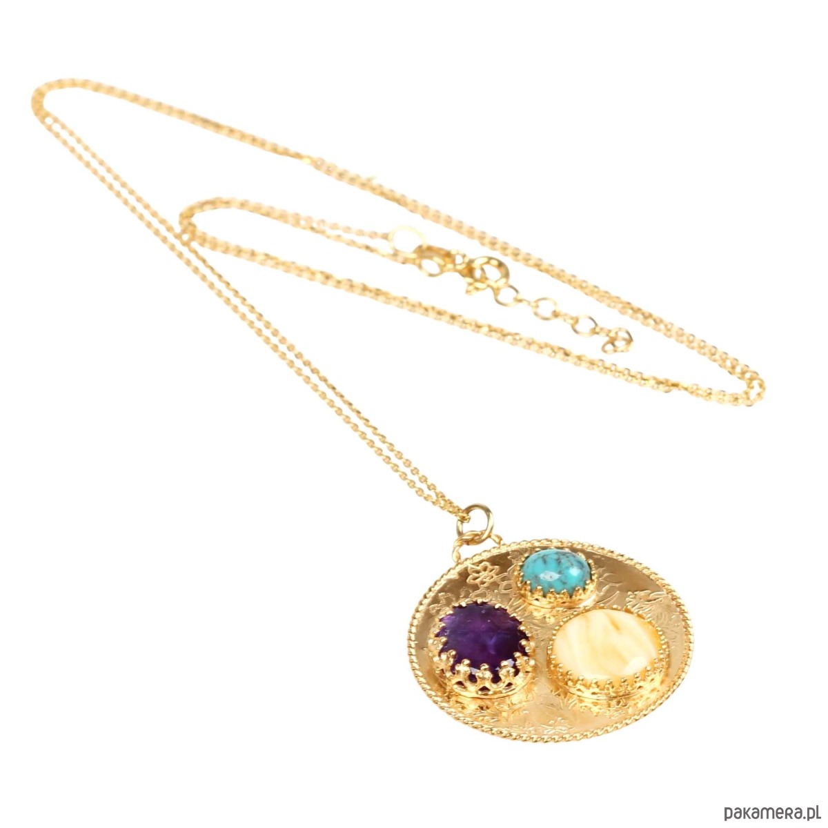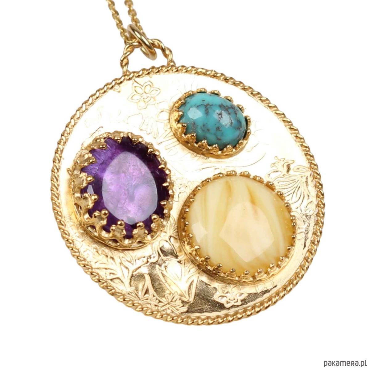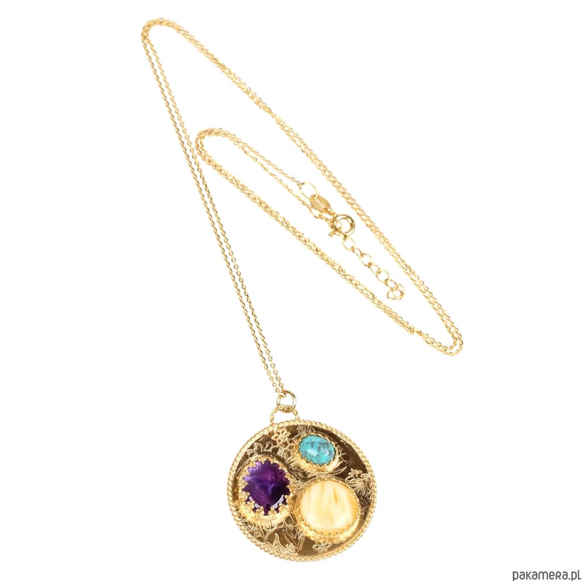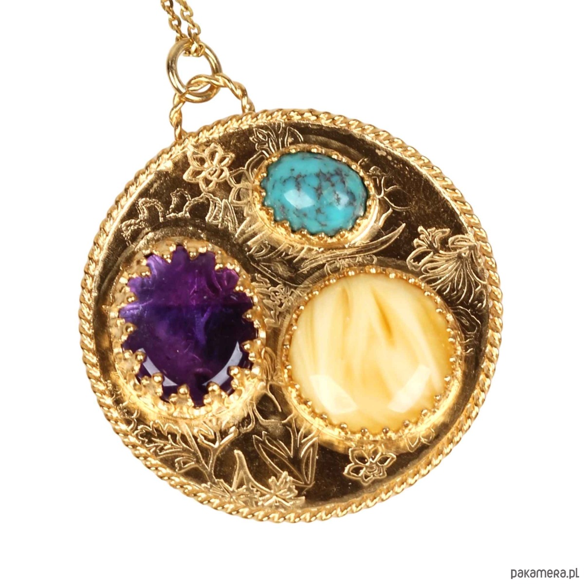 Złoty naszyjnik - medalion z turkusem, bursztynem i ametystem