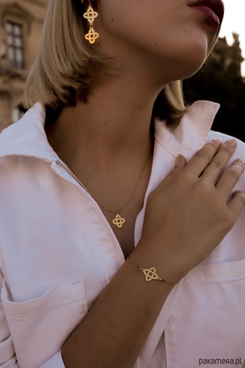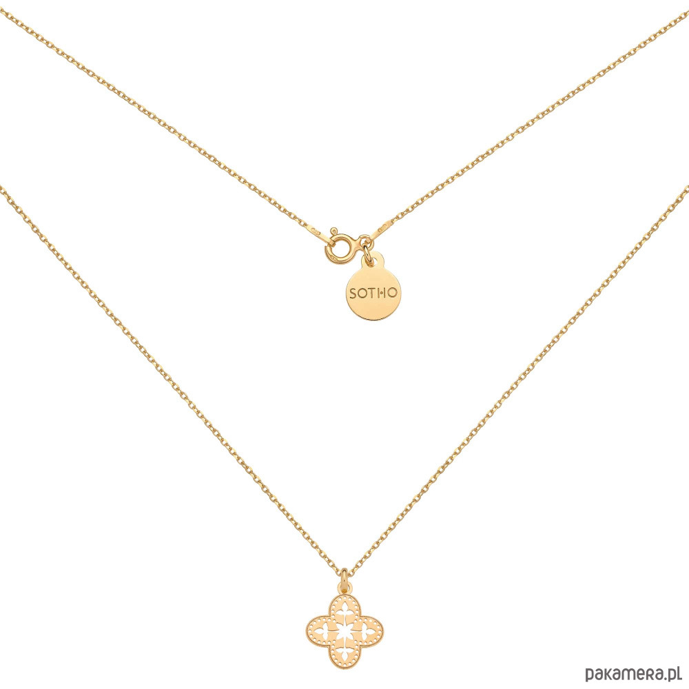 Złoty naszyjnik łańcuszkowy z ażurową rozetką i zawieszką z logo marki. Całość wykonana ze srebra 925 powlekanego 24 karatowym żółtym złotem.