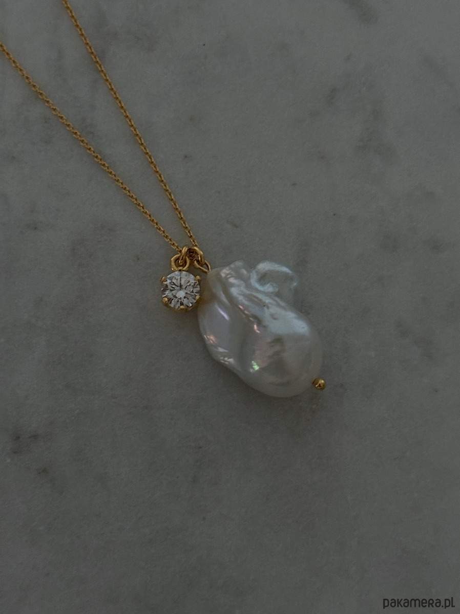 Złoty naszyjnik z barokową perłą i bezbarwną cyrkonią
