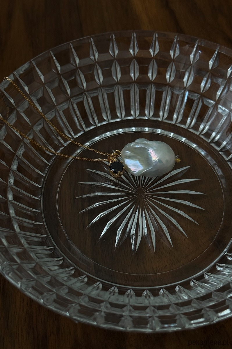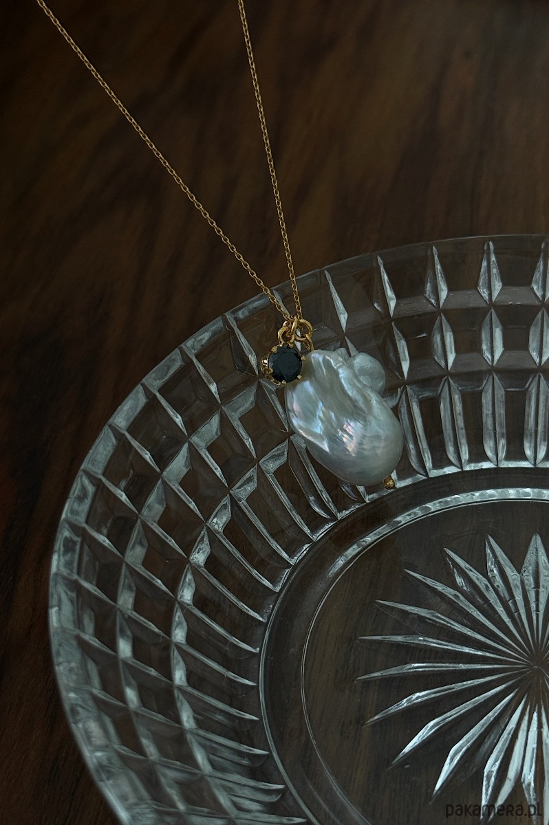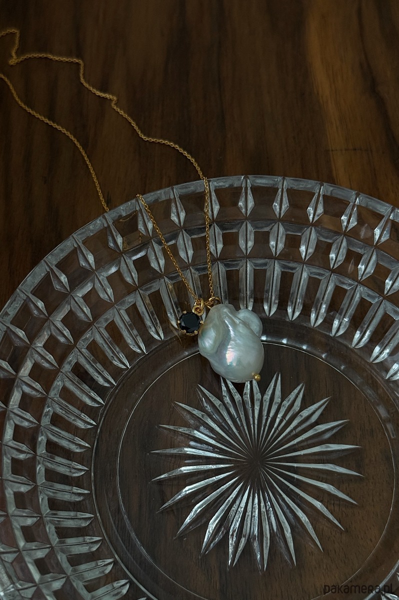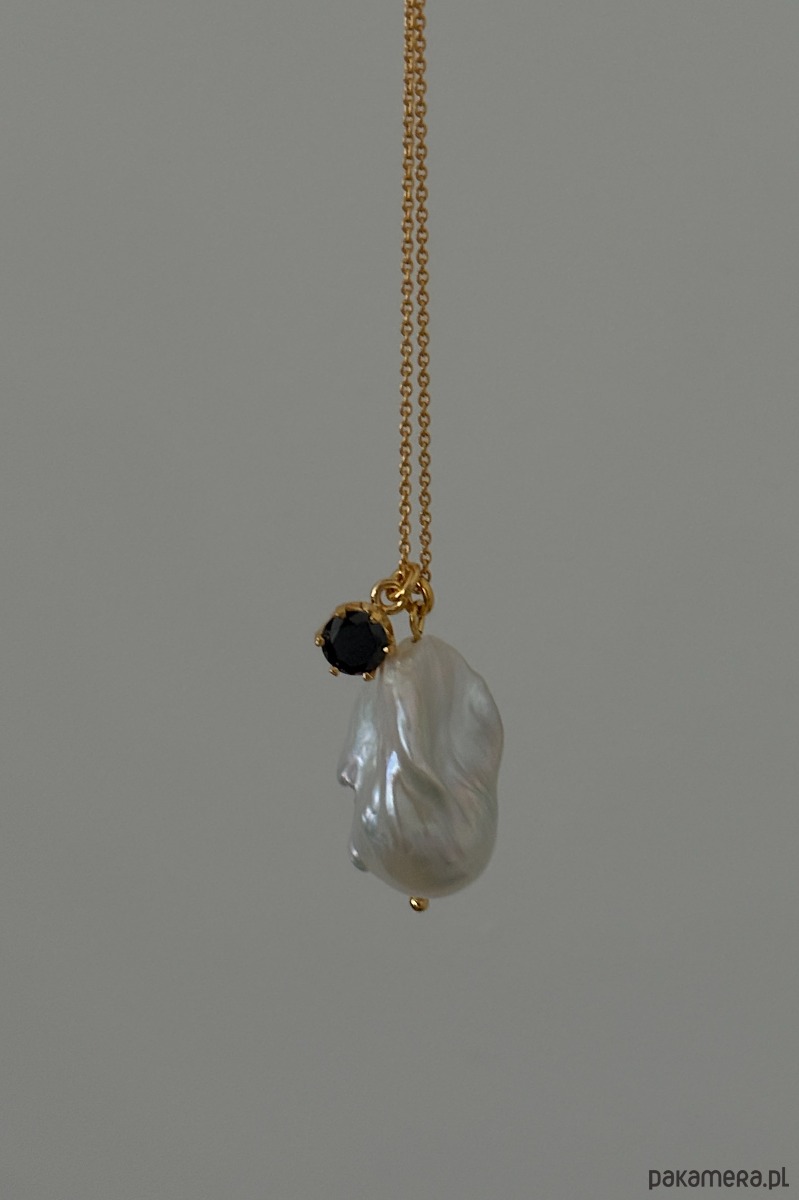 Złoty naszyjnik z barokową perłą i czarną cyrkonią