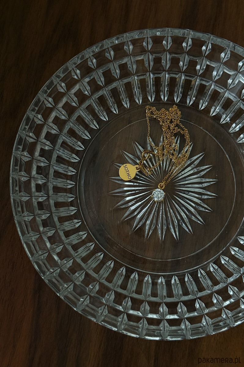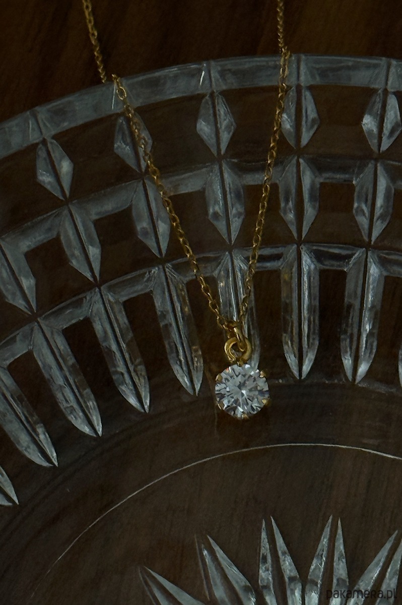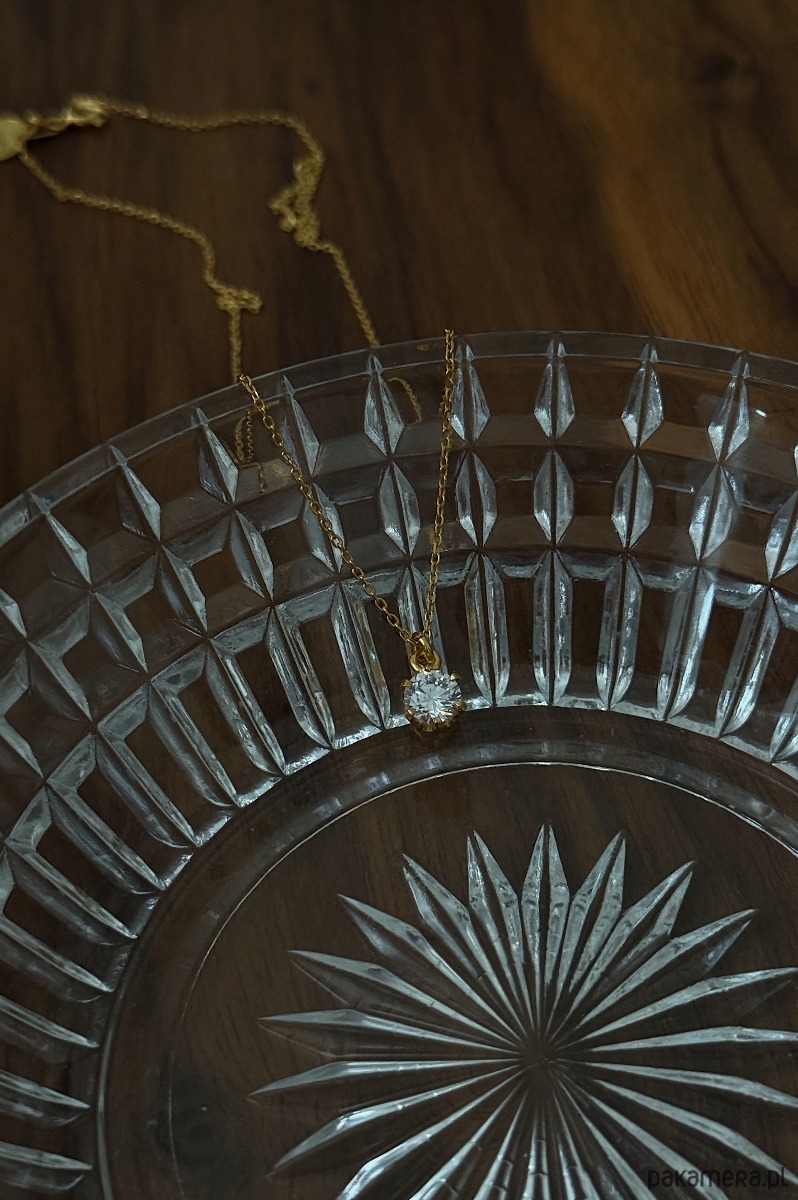 Złoty naszyjnik z bezbarwną cyrkonią i zawieszką z logo marki. Wszystkie elementy wykonane ze srebra 925 powlekanego 24 karatowym żółtym złotem.