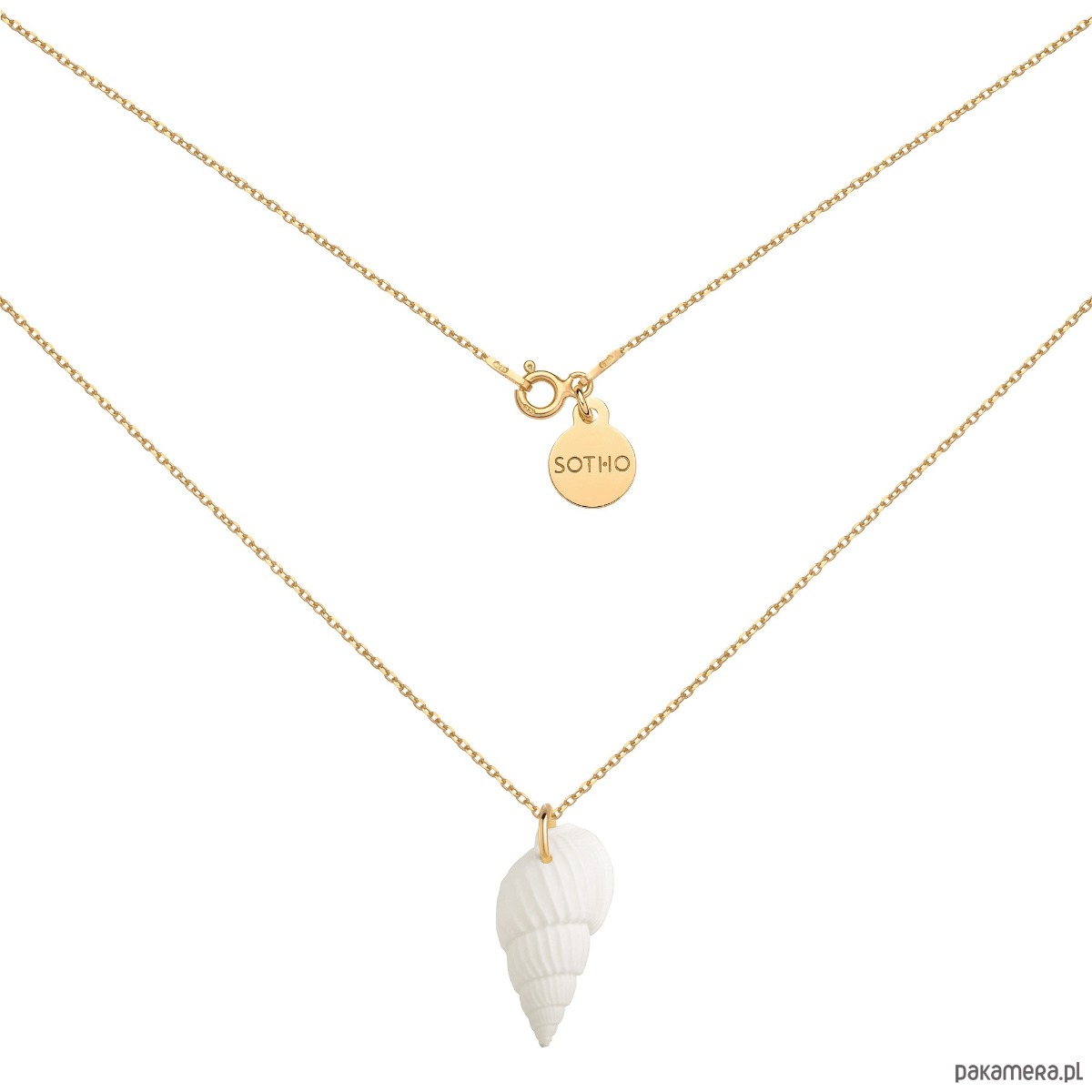 Złoty naszyjnik łańcuszkowy z muszelką i zawieszką z logo marki. Każdy egzemplarz posiada unikatową, niepowtarzalną muszelkę. Całość wykonana ze srebra 925 powlekanego 24 karatowym żółtym złotem.