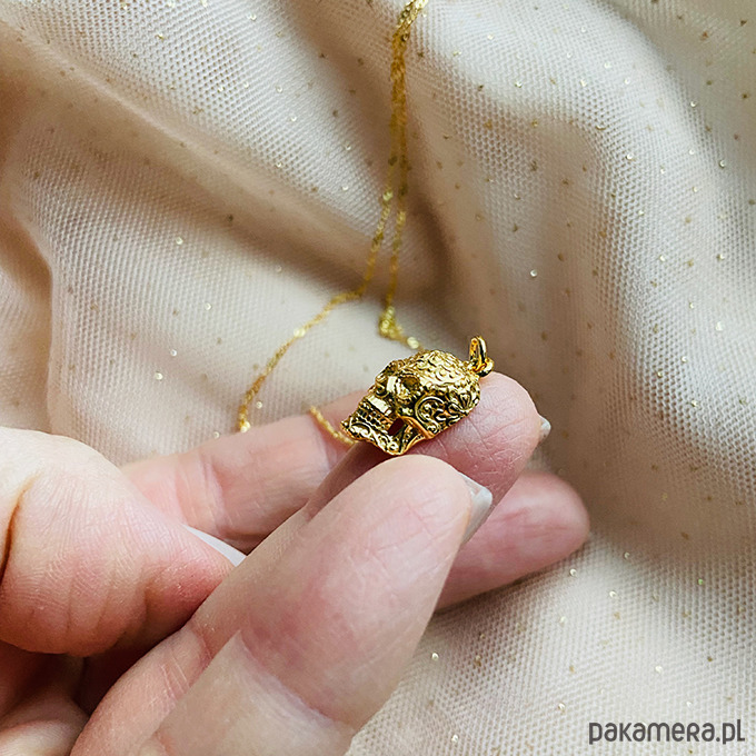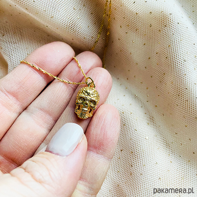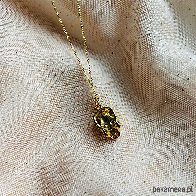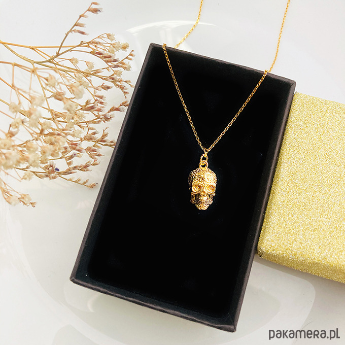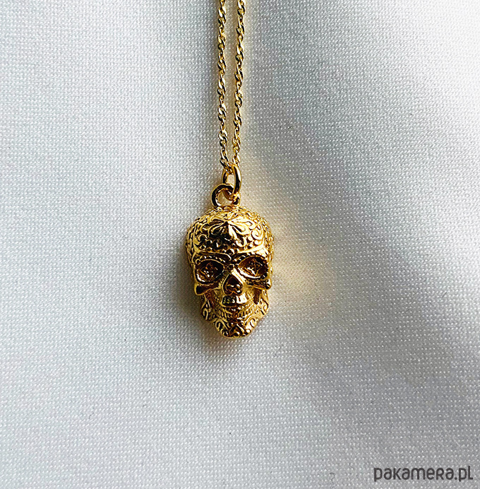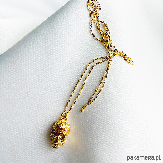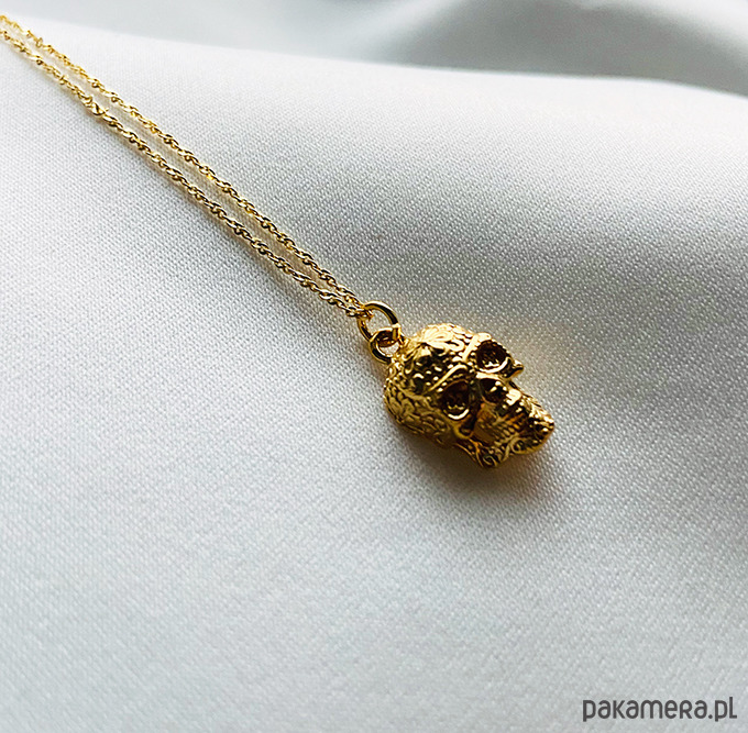 Inspirowany meksykańską sztuką naszyjnik z efektowną zawieszką w kształcie czaszki.Wykonany ze srebra próby 925 złoconego 24 k złotem.