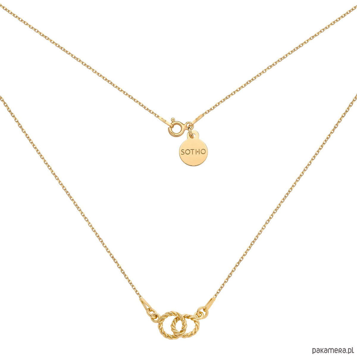 Złoty naszyjnik z ozdobnymi dwoma kółeczkami i zawieszką z logo marki. Całość wykonana ze srebra 925 powlekanego 24 karatowym żółtym złotem.