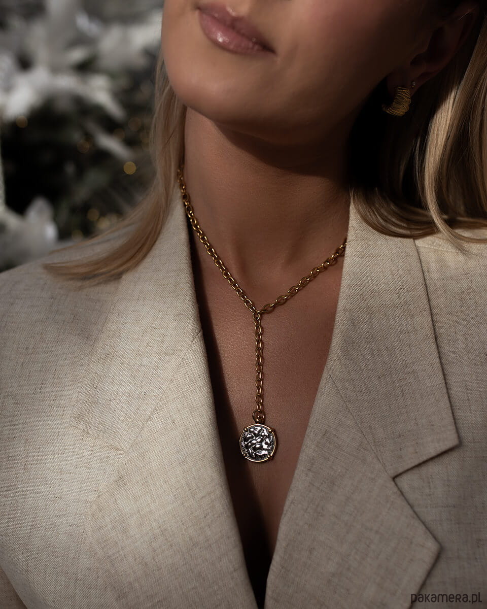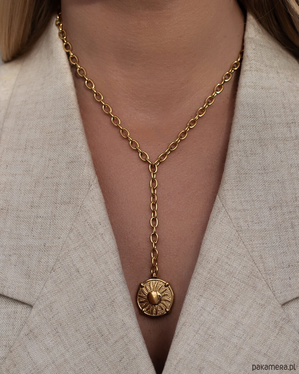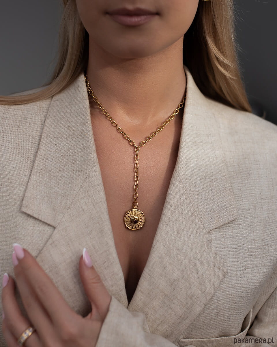 Złoty naszyjnik Luciana z dwustronną zawieszką w kształcie promiennego słońca to więcej niż tylko ozdoba, to talizman dobrej energii, kobiecej siły i pewności siebie. Zaprojektowany z myślą o kobietach, które kochają wyróżniać się klasą, a jednocześnie cenią trwałość i wygodę. Sprawdzi się zarówno jako dodatek na co dzień, jak i wyrazisty akcent do wieczorowej stylizacji.Wykonany jest z wysokiej jakości stali chirurgicznej premium, dzięki czemu, nie ciemnieje i jest wodoodporny. Możesz nosić go na co dzień, do pracy, na randkę, wakacje czy spotkanie z przyjaciółkami. Solidne ogniwa łańcuszka i wyrazista zawieszka tworzą idealną równowagę między elegancją, a siłą. Dodatkowy element łańcuszka pięknie układa się na dekolcie.To wybór dla kobiet, które chcą wyglądać pięknie, bez kompromisów.Luciana to doskonały wybór na urodziny, święta, walentynki czy... bez okazji. Zapakowany jest w pachnące, eleganckie pudełeczko, gotowe do wręczenia.Wymiary:Długość: 45 cm + 5 cm przedłużenia