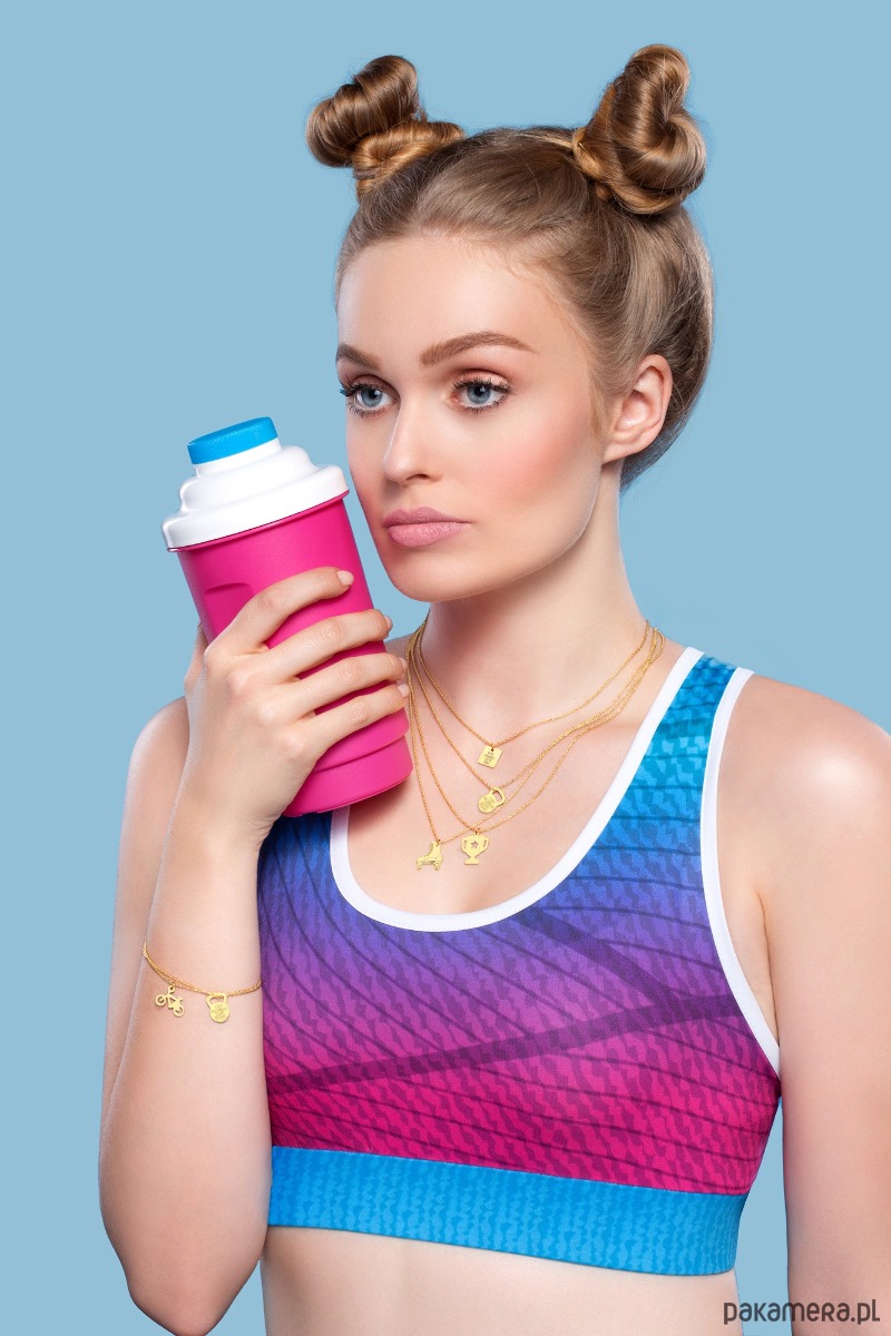Złoty naszyjnik łańcuszkowy zdobiony ciężarkiem kettlebellem i zawieszką z logo marki. Całość wykonana ze srebra 925 powlekanego 24 karatowym żółtym złotem.