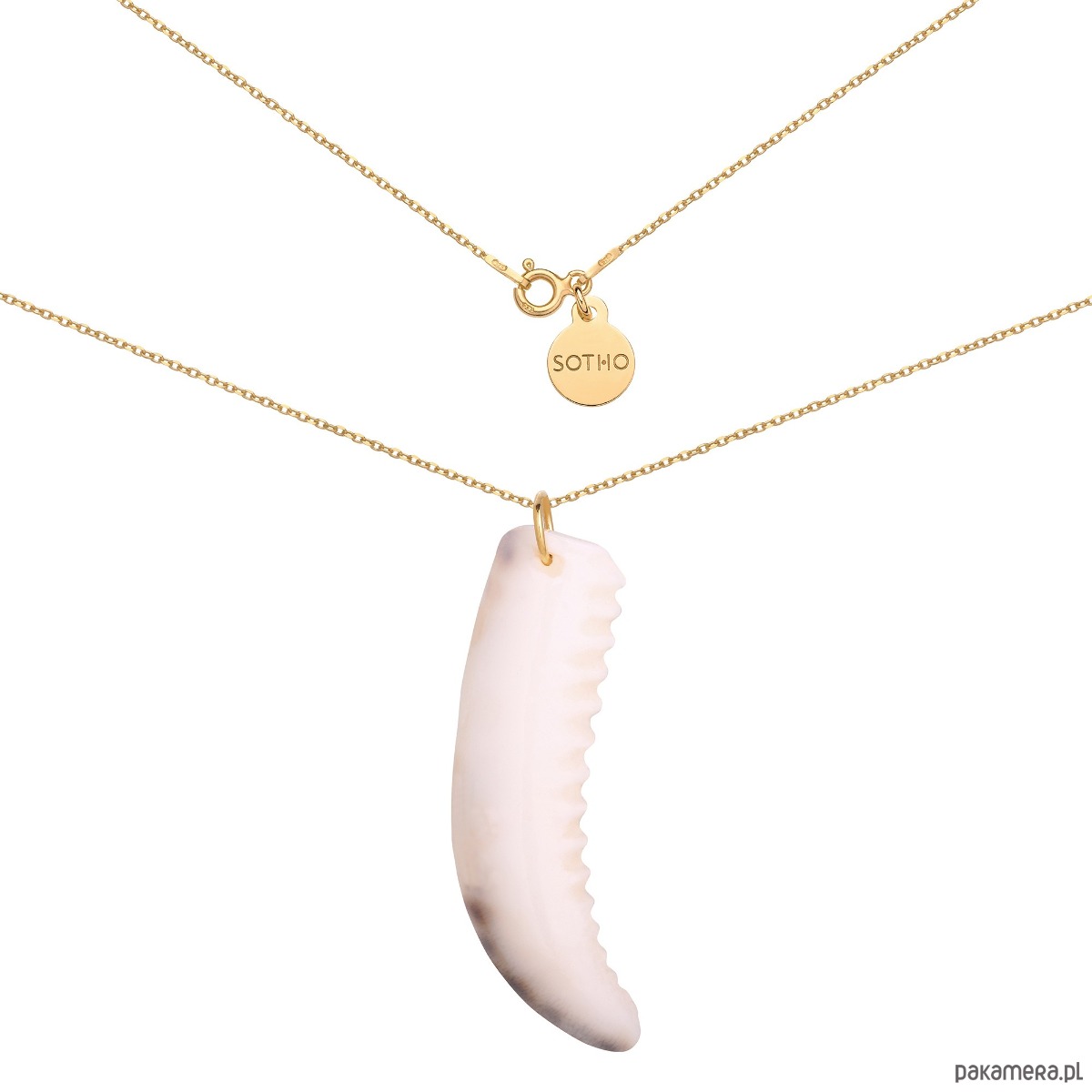 Złoty naszyjnik łańcuszkowy z kłem rekina i zawieszką z logo marki. Każdy egzemplarz posiada unikatowy, niepowtarzalny kieł. Całość wykonana ze srebra 925 powlekanego 24 karatowym żółtym złotem.