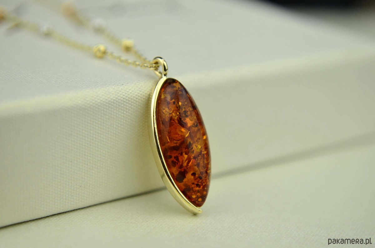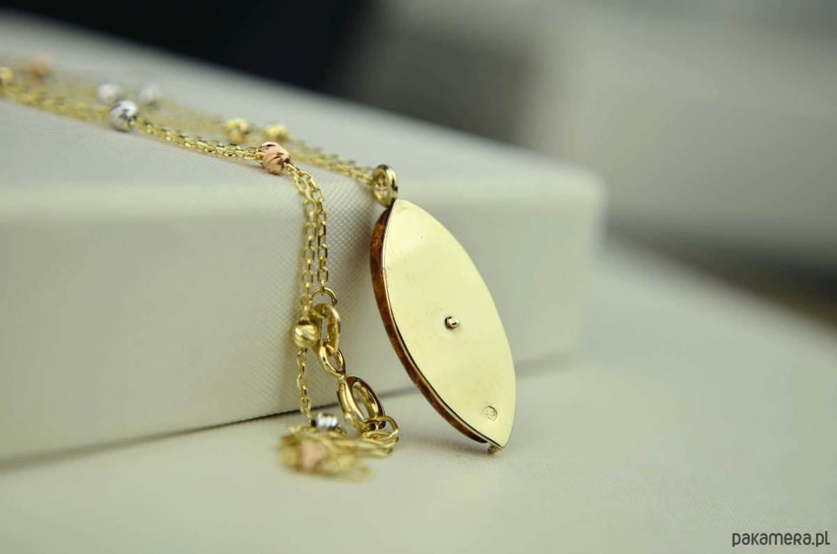 Nowoczesny naszyjnik wykonany z koniakowego bursztynu i błyszczącego złota. Bursztyn wypełniony jest po brzegi połyskującymi łuskami, z jednej strony ogranicza go złota ramka, z drugiej możemy zajrzeć z boku w jego wnętrze. Bursztynowa zawieszka połączona jest ze złotym łańcuszkiem, który ozdobiony jest dodatkowo kuleczkami w trzech kolorach złota. To doskonała propozycja dla miłośniczek złota i złota Bałtyku.
