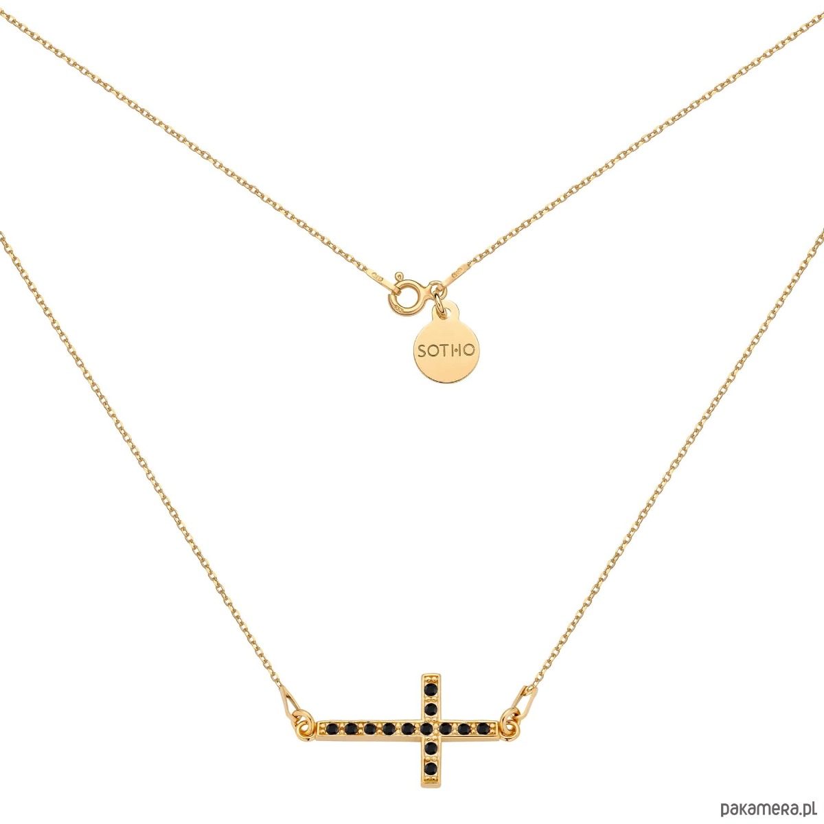 Złoty naszyjnik łańcuszkowy zdobiony krzyżem wysadzanym czarnymi kryształami SWAROVSKI® CRYSTAL w kolorze Jet i zawieszką z logo marki. Całość wykonana ze srebra 925 powlekanego 24 karatowym żółtym złotem.