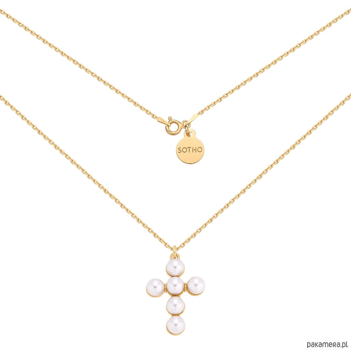 Złoty naszyjnik z krzyżem zdobionym perłami SWAROVSKI® CRYSTAL w kolorze białym White i zawieszką z logo marki. Całość wykonana ze srebra 925 powlekanego 24 karatowym żółtym złotem.