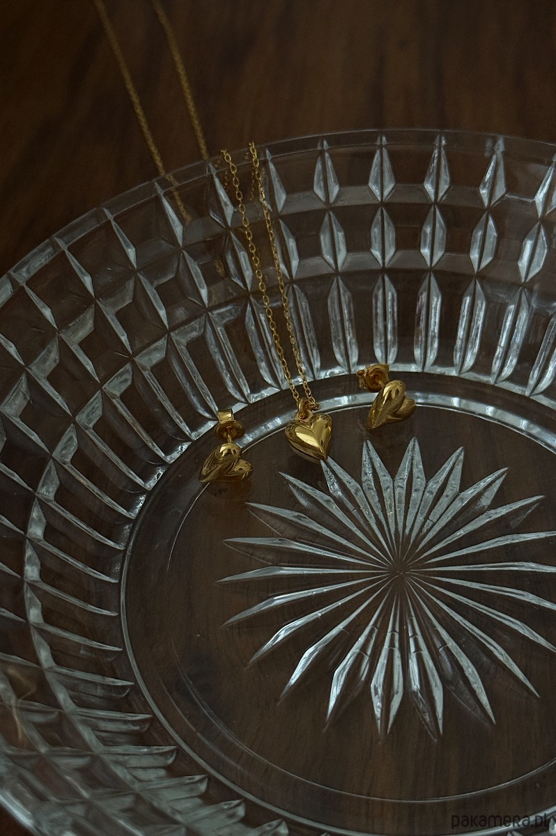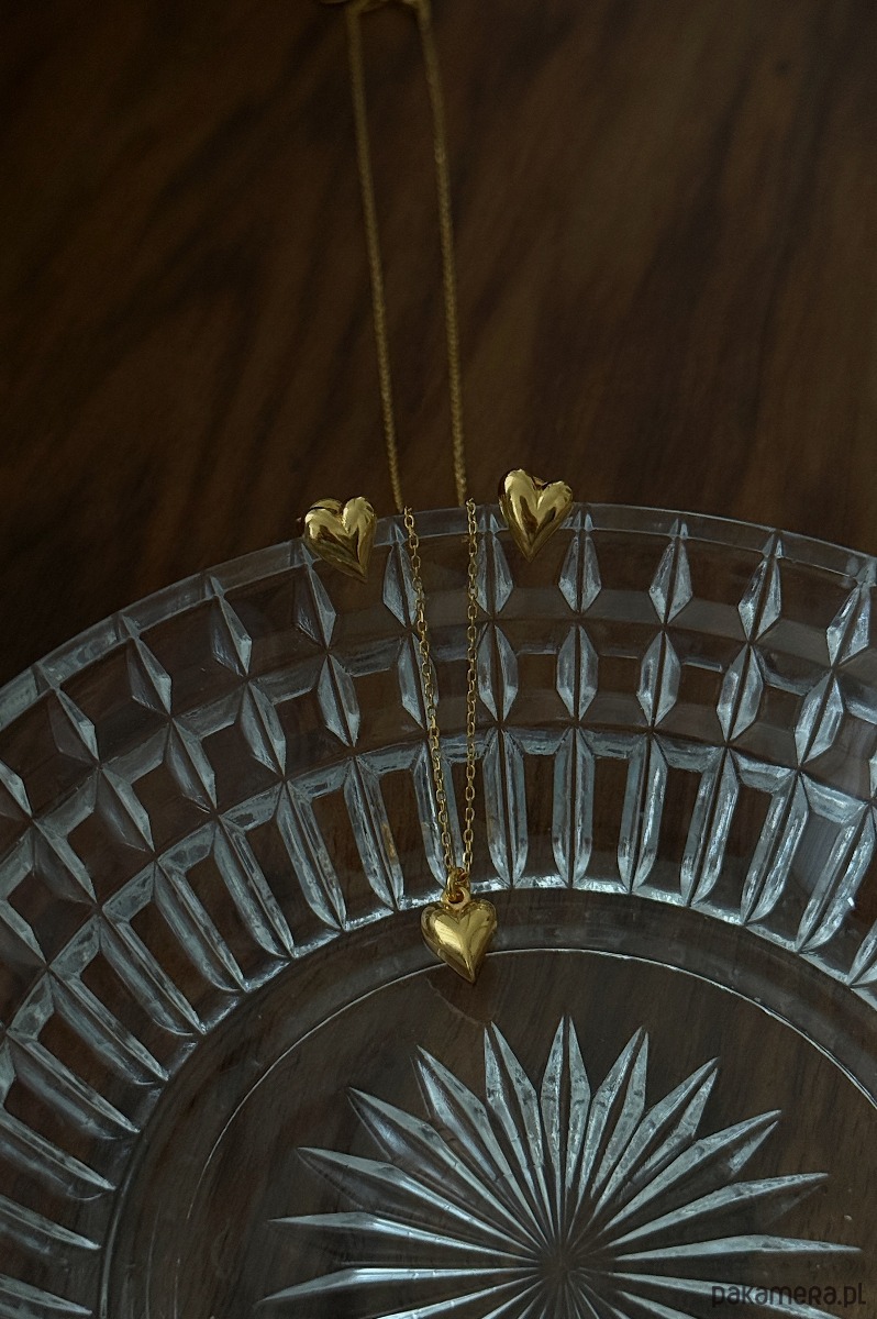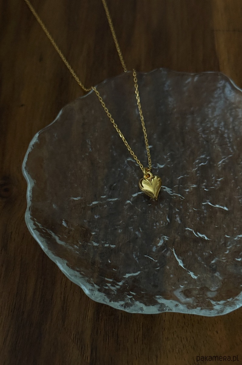 Złoty naszyjnik z małym serduszkiem oraz zawieszką z logo marki. Całość wykonana ze srebra 925 powlekanego 24 karatowym żółtym złotem.