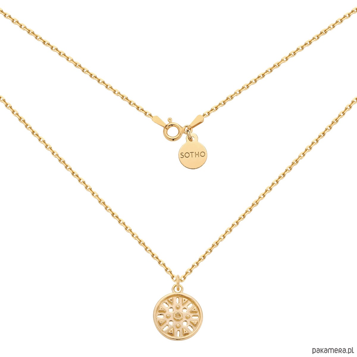 Złoty łańcuszek z medalionem oraz zawieszką z logo marki. Całość wykonana ze srebra 925 powlekanego 24 karatowym żółtym złotem.