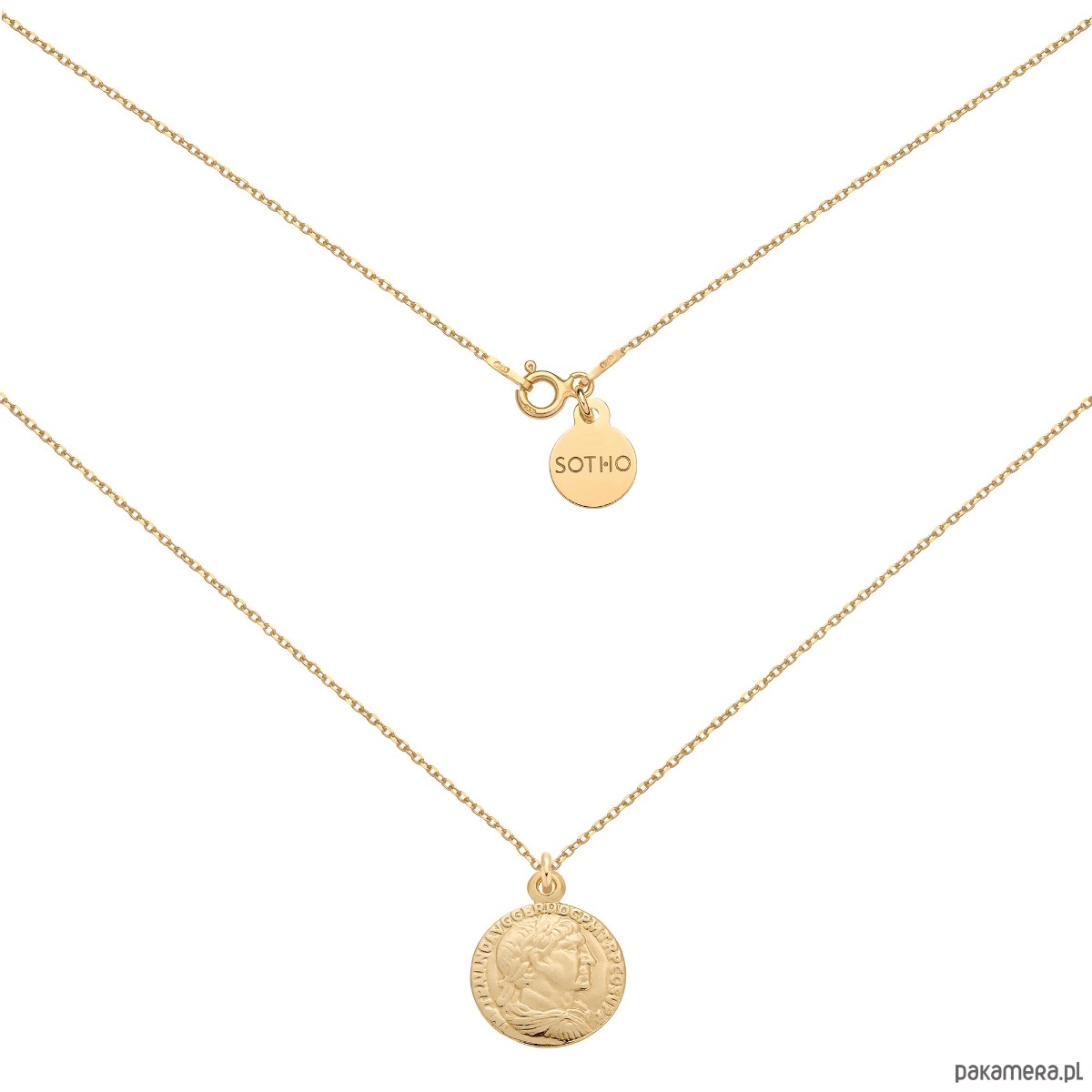 Złoty naszyjnik łańcuszkowy zdobiony monetą i zawieszką z logo marki. Całość wykonana ze srebra 925 powlekanego 24 karatowym żółtym złotem.