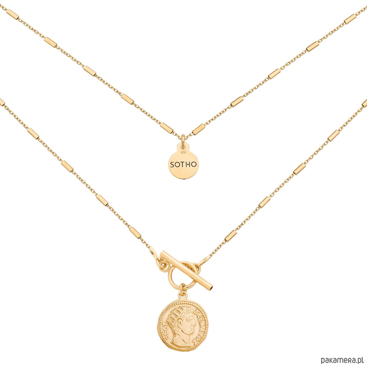 Złoty naszyjnik zdobiony starą monetą, ozdobnym zapięciem i zawieszką z logo marki. Wszystkie elementy wykonane ze srebra 925 powlekanego 24 karatowym żółtym złotem.