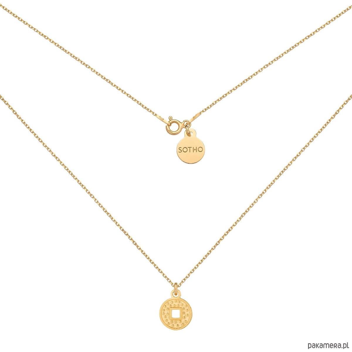 Złoty naszyjnik łańcuszkowy zdobiony monetą i zawieszką z logo marki. Całość wykonana ze srebra 925 powlekanego 24 karatowym żółtym złotem.