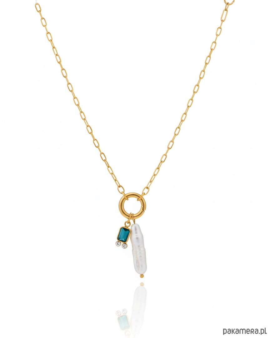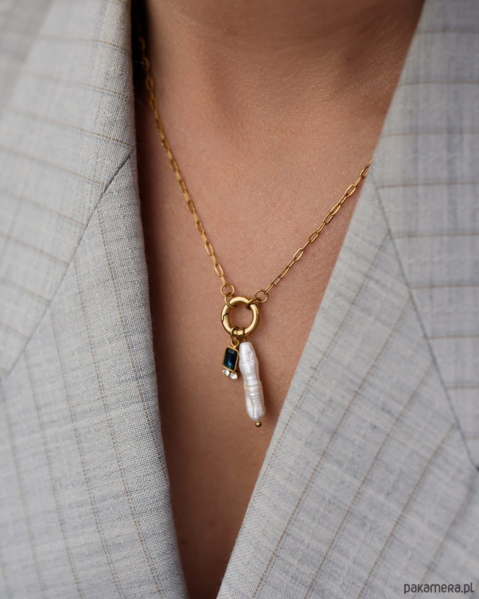 Złoty naszyjnik z naturalną perłą i cyrkoniami ze stali chirurgicznej