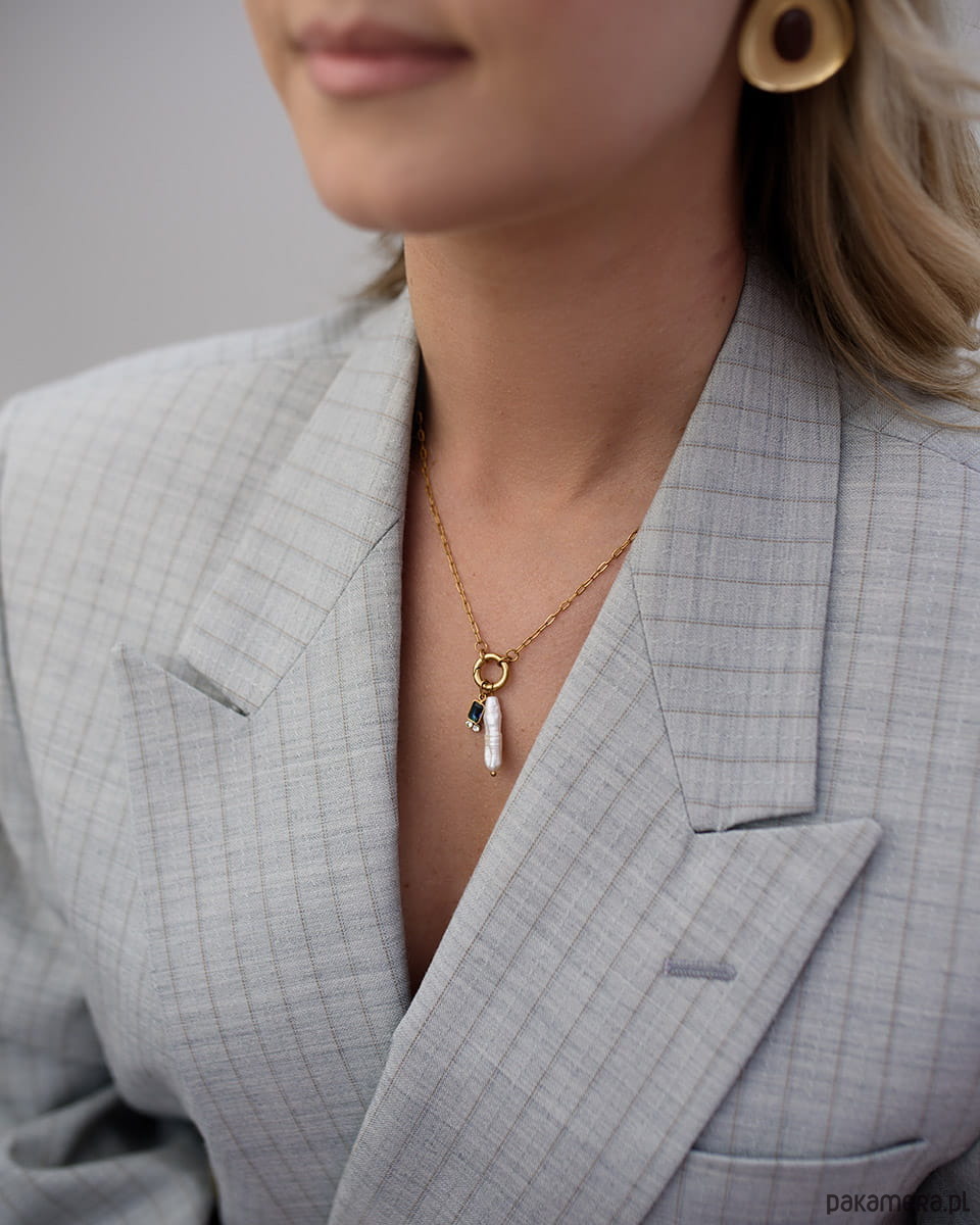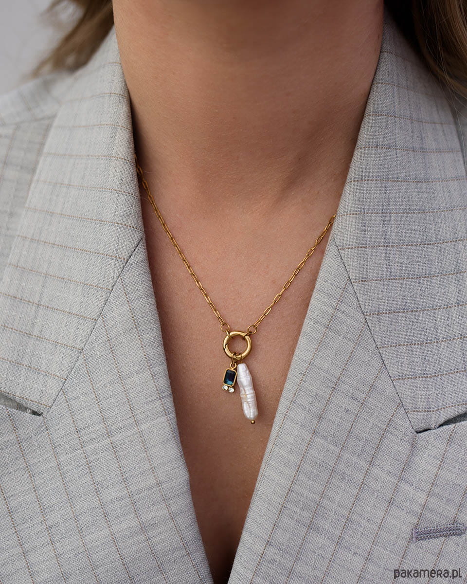 Cienki złoty łańcuszek połączony z zawieszką, w której naturalna perła spotyka się z delikatnym akcentem cyrkonii. Miękki, nieregularny kształt perły zestawiony z geometrycznym kształtem cyrkonii tworzy nowoczesny, elegancki efekt.