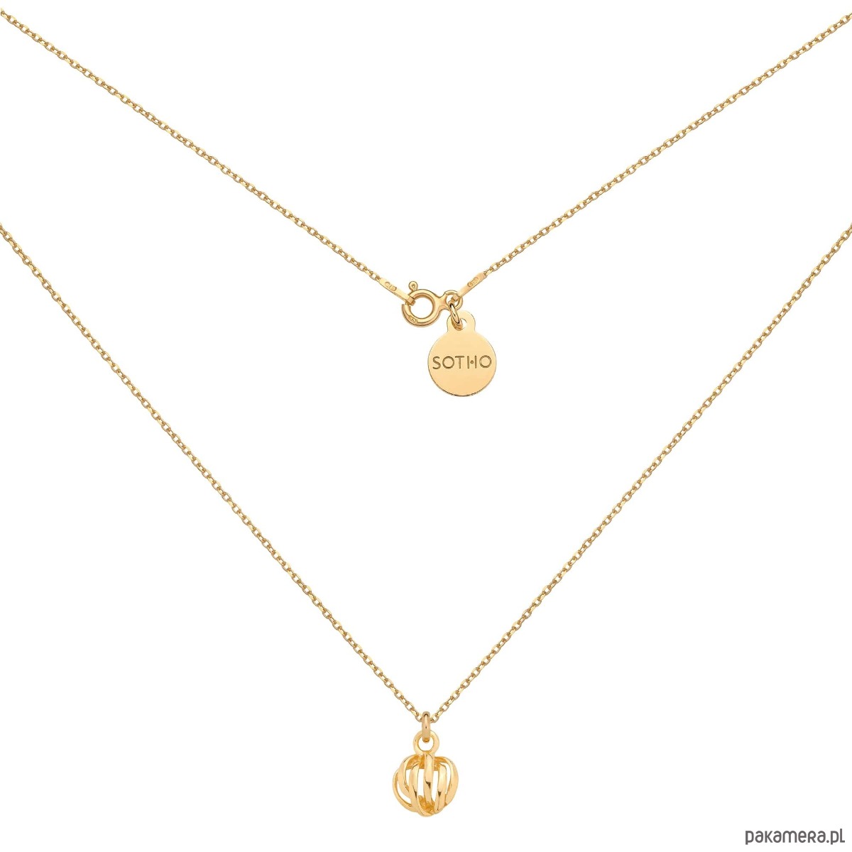 Złoty naszyjnik łańcuszkowy zdobiony ozdobną zawieszką i zawieszką z logo marki. Całość wykonana ze srebra 925 powlekanego 24 karatowym żółtym złotem.
