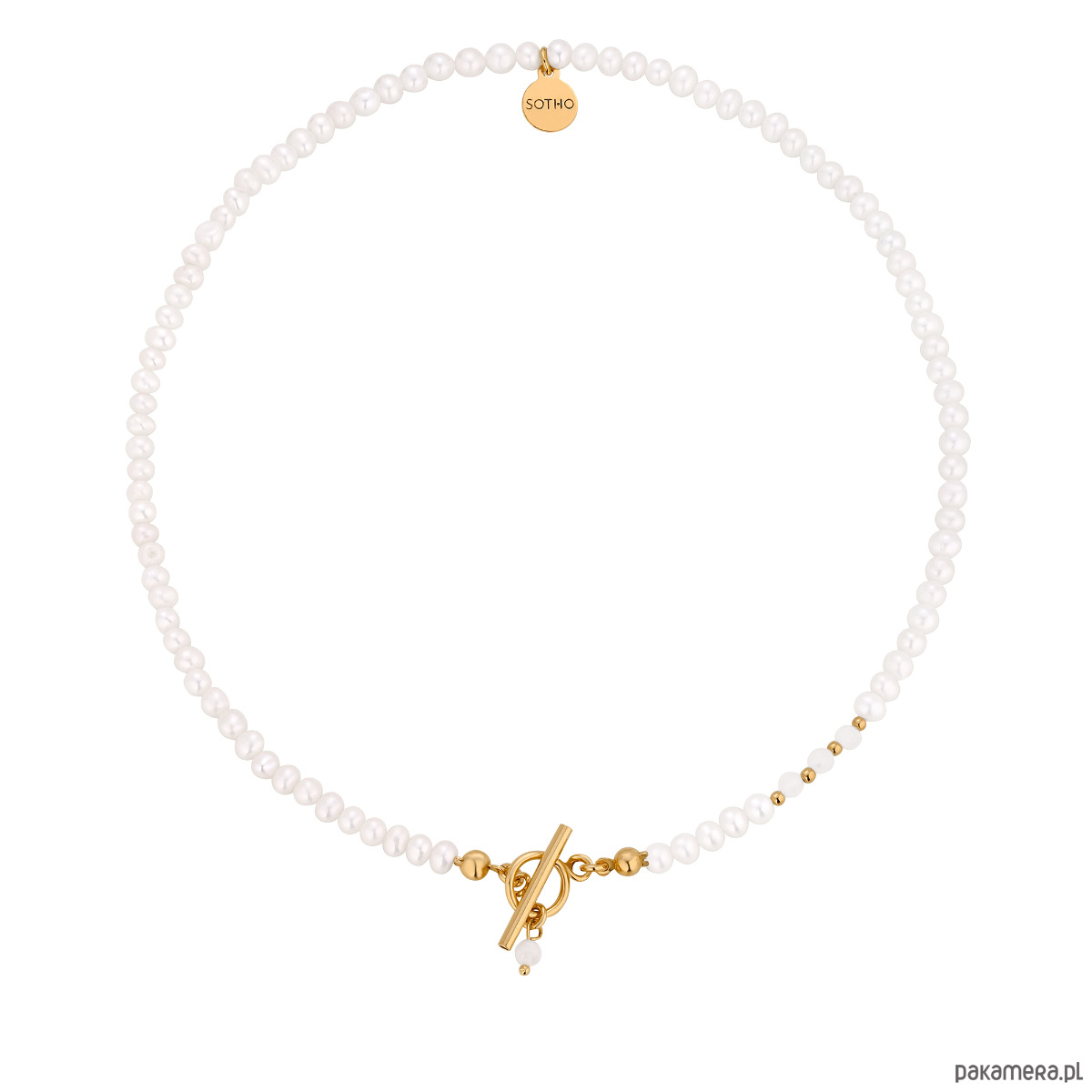 Złoty naszyjnik wykonany z naturalnych pereł słodkowodnych, fasetowanego kamienia księżycowego, złotych kuleczek i zawieszką z logo marki. Wszystkie elementy wykonane ze srebra 925 powlekanego 24 karatowym żółtym złotem.