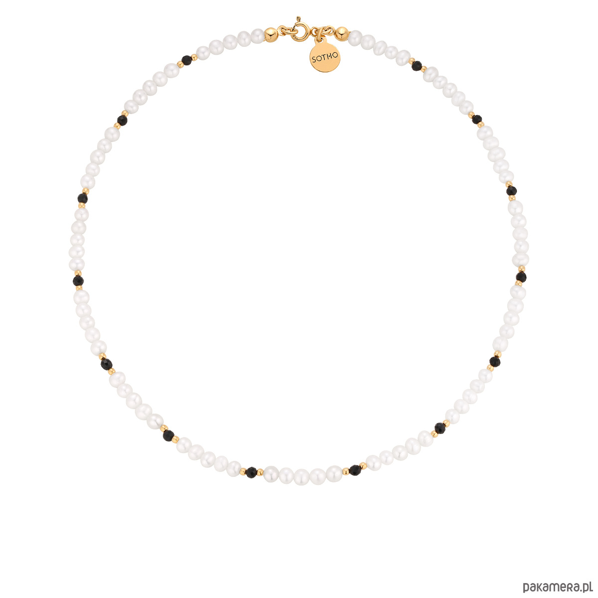 Złoty naszyjnik wykonany z naturalnych pereł słodkowodnych, fasetowanego onyksu, złotych kuleczek i zawieszki z logo marki. Wszystkie elementy wykonane ze srebra 925 powlekanego 24 karatowym żółtym złotem.