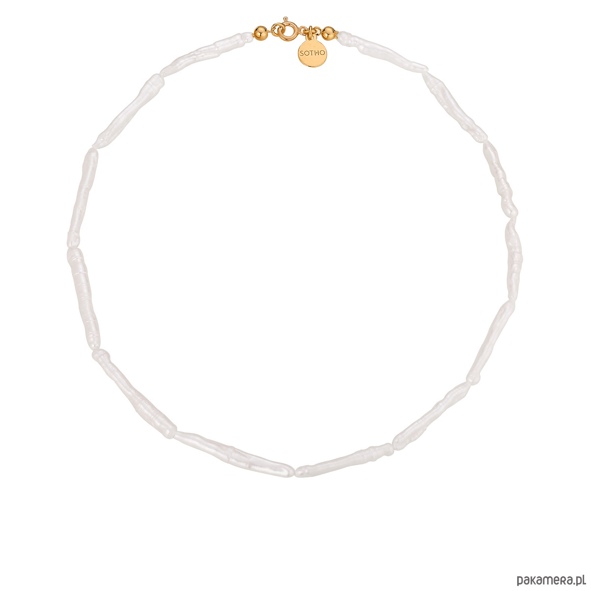 Złoty naszyjnik wykonany z naturalnych pereł słodkowodnych, ozdobiony zawieszką z logo marki. Wszystkie elementy wykonane ze srebra 925 powlekanego 24 karatowym żółtym złotem.